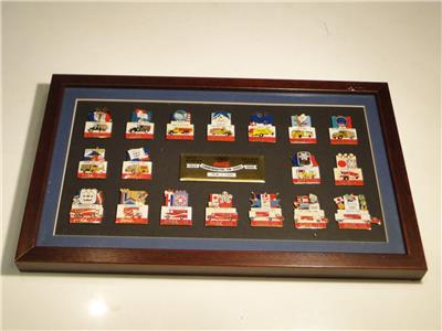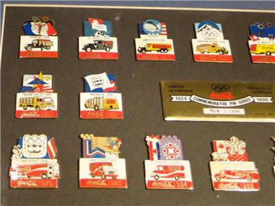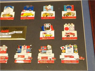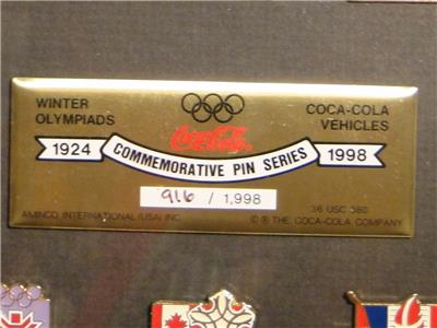 This is for a framed set of Coca Cola Vehicles Winter Olympiad Commemorative Pin Series pins. 1924-1998. #916/1998. Aminco Intl USA. Pins are in excellent condition. For your collection or display.