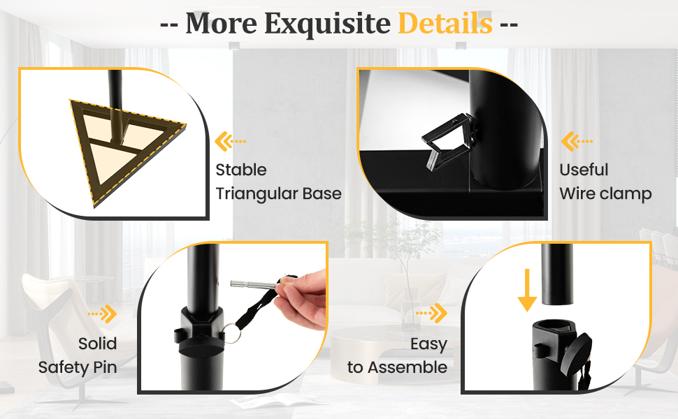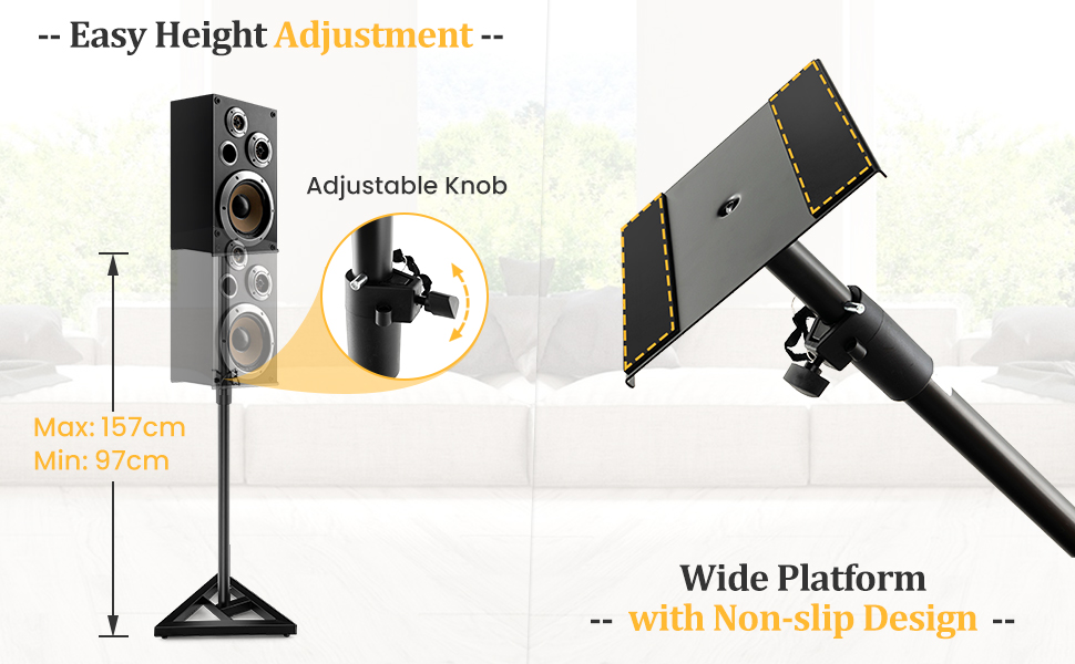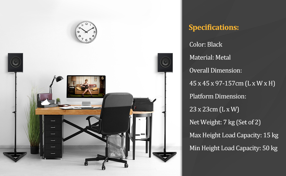With 6 positions of adjustable height ranging from 97cm to 157cm, this studio monitor stands allows you to find the perfect placement for your speakers. It is designed to accommodate multiple monitor speakers of different sizes, offering flexibility and reliability. Besides, this stand creates an immersive sound experience and impresses with its exceptional sound quality, which is suitable for various scenarios such as home, office, wedding, or club settings. Additionally, it is made of high quality metal frame to ensure stability and security, the Max height load capacity is 15kg and Min height load capacity is 50kg. And the rubberized non-skid padding stickers further keep your equipment securely in place.