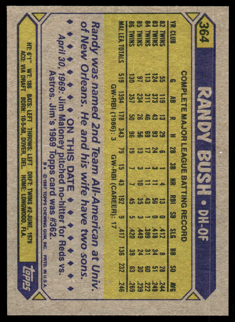 | 1987 Topps Baseball Card 364 Randy Bush |