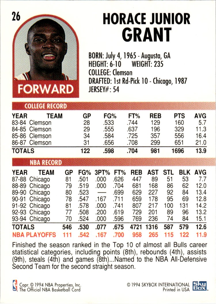 | Description: | Horace Grant | | Category: | Basketball | | Year: | 1994 | | Product: | NBA Hoops Basketball Card | | Team: | Chicago Bulls | | Card Number: | 26 | | Dimensions: | 3½" x 2½" |
