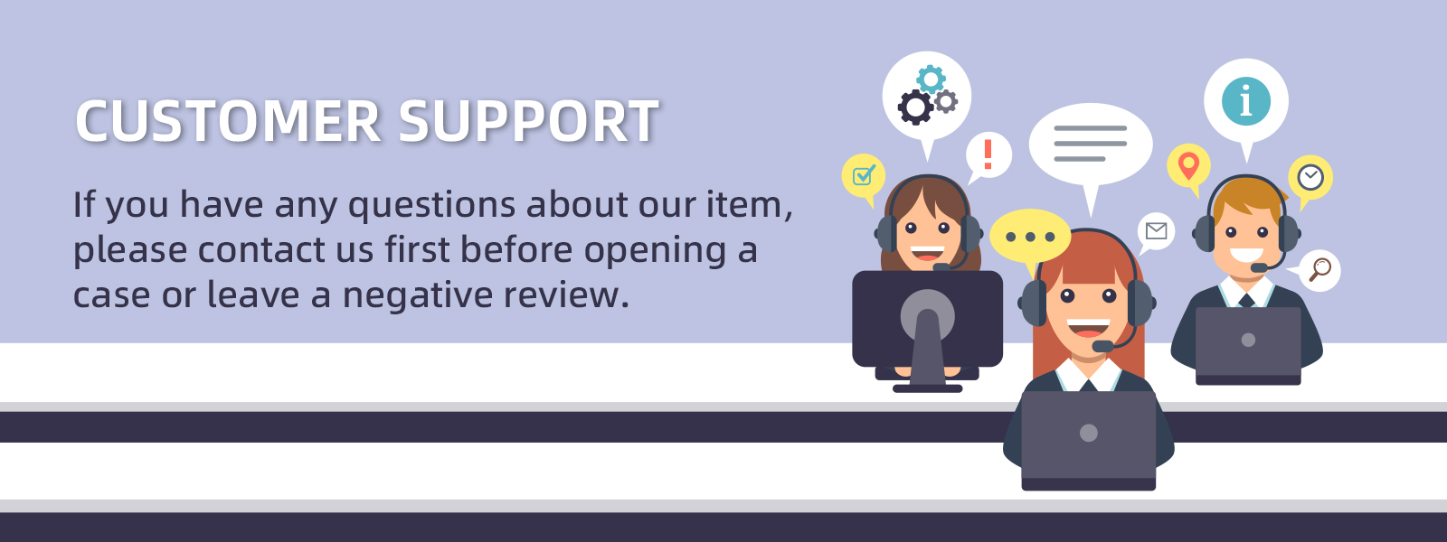 If you intend to leave a Negative / Neutral Feedback or low scores for any of the categories in the feedback area, please make sure you contact us first to provide us a chance to resolve any issues which you might have with your item.