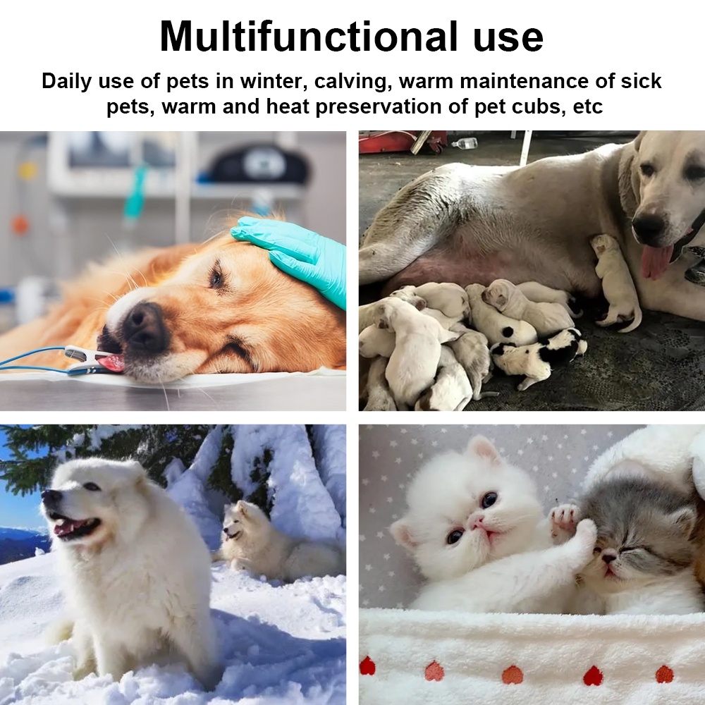 [multifunctional electric heating pad]1. On the pet bed; 2. On a pet mat; 3. On the floor; 4. In the pet cage. Quadruped pets need a heating pad when they are: pregnant and lactating; 2. Newborn pets; 3. Diseases in pets; 4. Cold weather. 5. Joint pressure and pain in elderly animals.