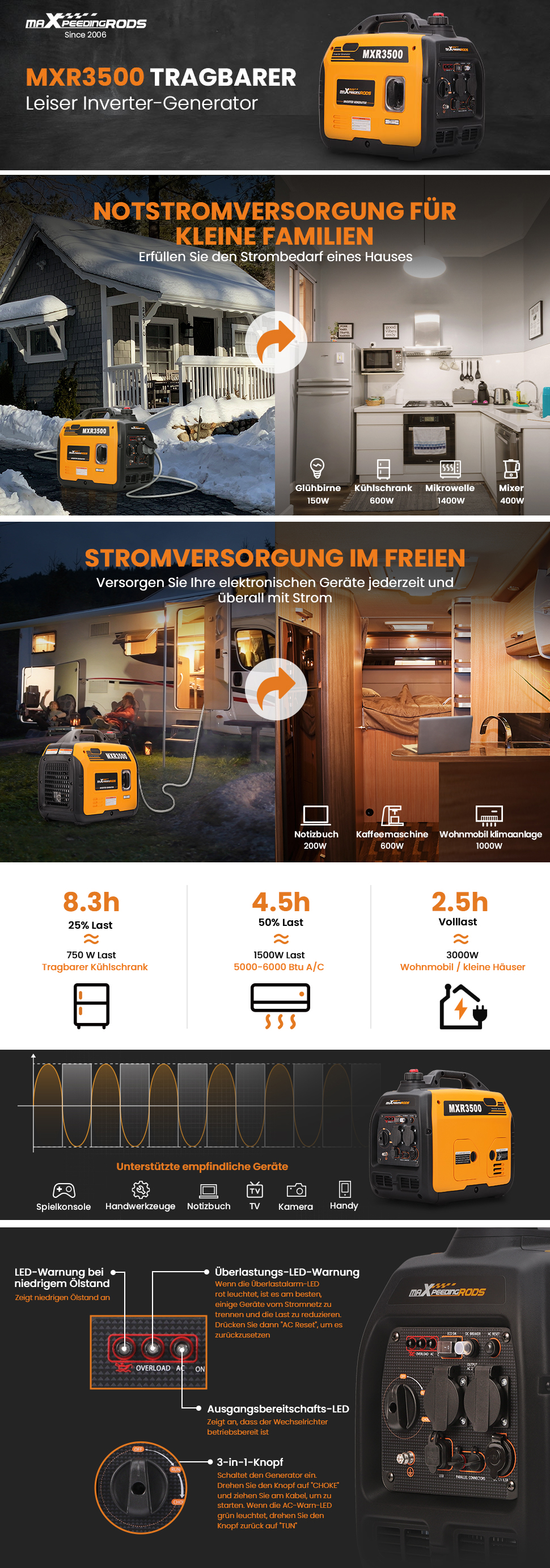 • Der Inverter Stromerzeuger Liefert nicht nur Strom for Haushalts-grossgeräte (NIEMALS im Innenbereich verwenden) und Elektrowerkzeuge sondern dient auch als Notstromaggregat bei Stromausfällen. Dank der Kompakten Bauform Ist er Ideal for alle Einsatzzwecke beim Camping oder Rund um den Garten geeignet. Sie müssen nie wieder ohne Strom sein.
