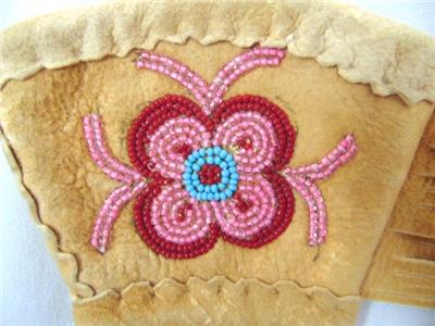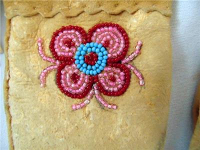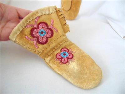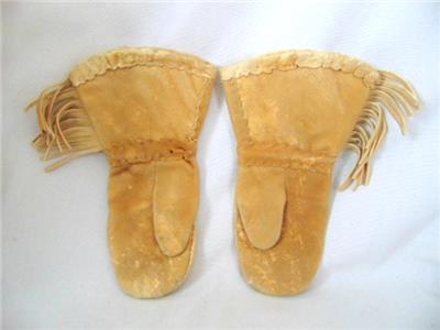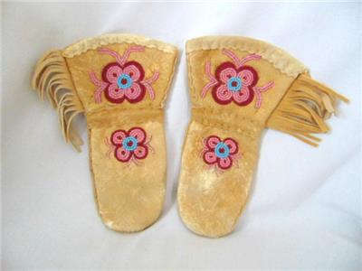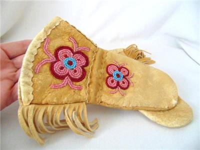 Wonderful pair of hand made suede leather glass beaded children's mittens measuring about 8" in length - 4-1/2" across the gauntlet opening and 2-1/2" across the curved end. Featuring lovely hand beaded floral accents in shades of pink and blue, you can faintly see the pattern drawn on the leather underneath the beaded design - mitten cuffs are fringed, complete with a felted trade fabric lining.