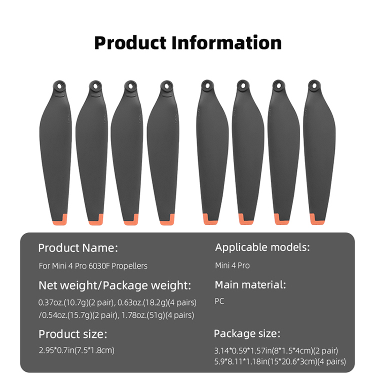 Features: High toughness material, high pneumatic efficiency High quality PC, durable; Low power consumption, strong endurance Quick disassembly and installation, saving time and labor Specification: Material: PC Color: Orange Types (Optional): 2 Pairs, 4 Pairs Size: 7.5 x 1.8 cm Applicable Models: for DJI MINI Pro 4 Package: 2x Paddle Pairs Or 4x Paddle Pairs Note: When replacing paddles, use the paddles in the same package, do not mix with paddles in other packages, it is recommended that you purchase two pairs of paddles for replacement at the same time