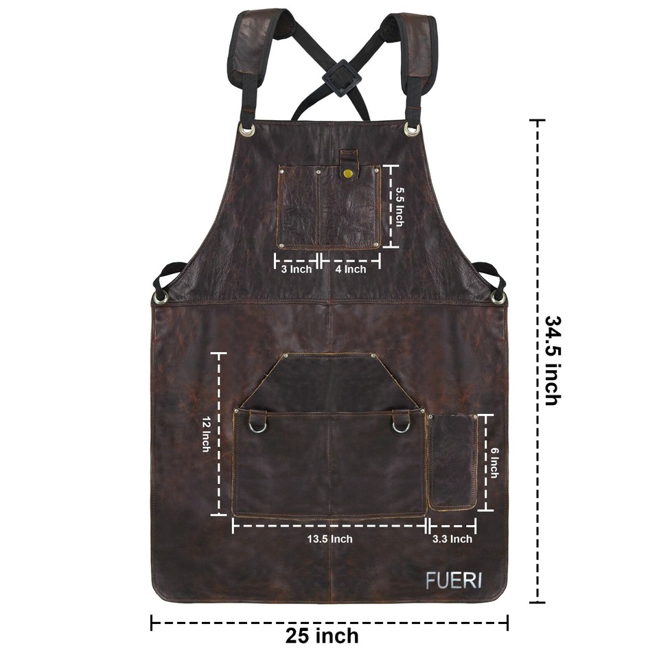 LENGTH: 34.5-inch WIDTH: 25-inch FUERI professionals woodworking / woodpeckers leather tool apron for men and women is reinforced with heavy gun-metal grommets, rivets and can take whatever your workstation has to throw at it. It has a soft and delicate feel, strong flexibility, wear resistance and stain resistance.