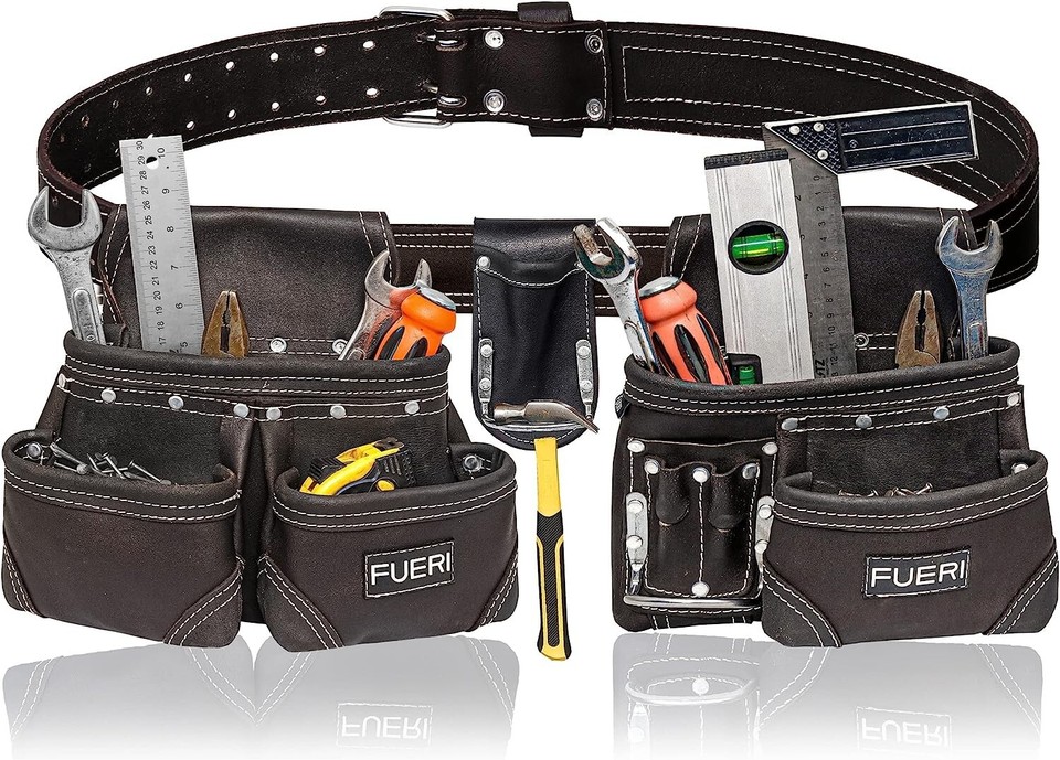 BELT: Adjustable toolbelt has a 2” wide heavy duty and 4mm Thick Cow Leather. It is 52” Long and can Fit from Size 29” up to 45” waist size (Over the Cloths)