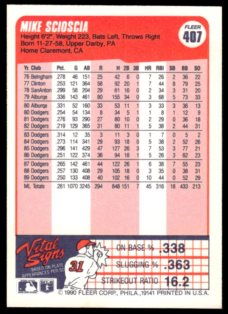 | 1990 Fleer Baseball Card 407 Mike Scioscia |