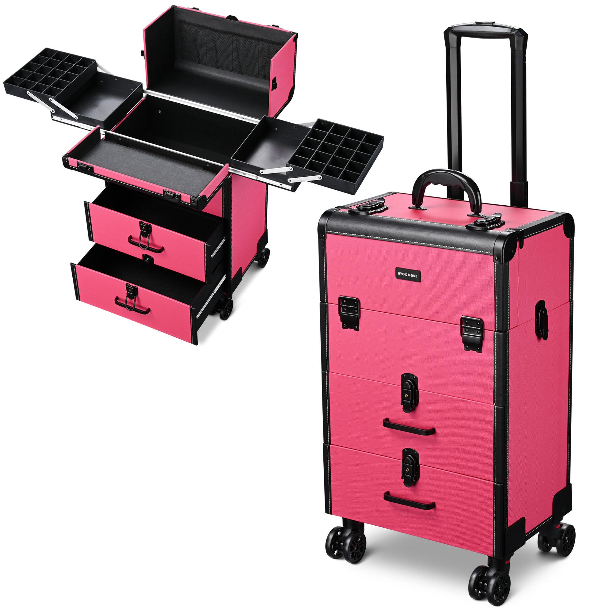 - Eye-catching Design - 15"x12"x26" Byootique Stylish Rolling Makeup Train Case comes in bright pink with matte finish and black edges for delivering an eye-catching look, enabling you to show your unique fashion taste wherever you go; Its compact size allows for easy storing and portability, ideal for professional makeup artists, manicurists, freelance beauticians, beauty bloggers, etc.