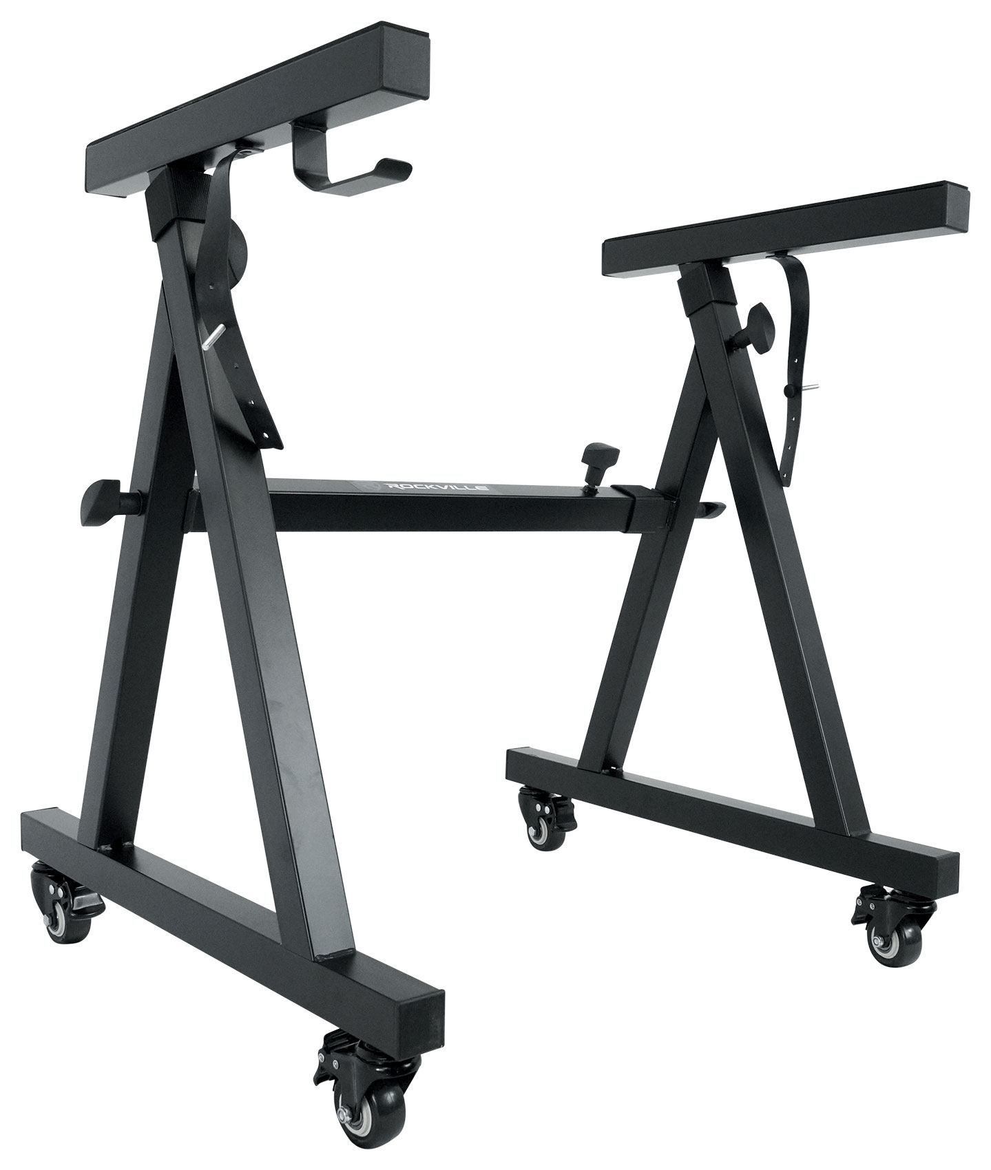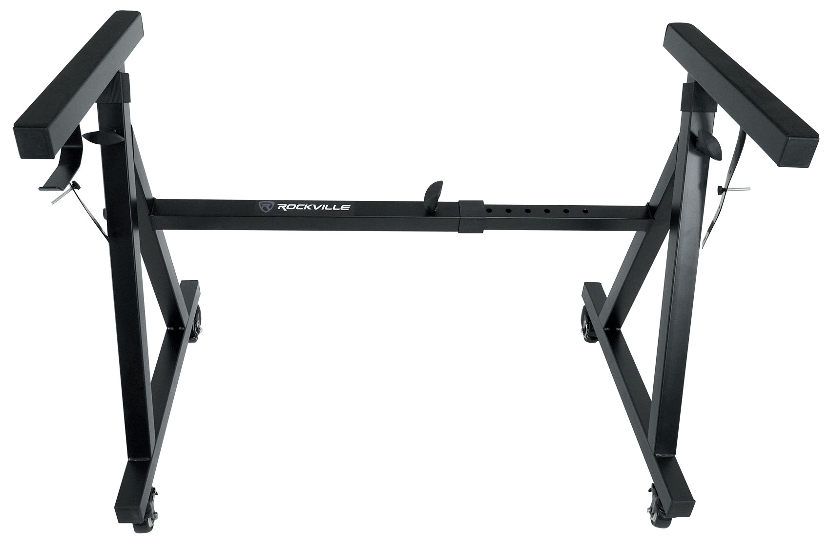 The Z40W by Rockville is a portable Z-style keyboard stand with lockable wheels that also includes a travel bag. This stand is way sturdier than an X stand. It has an adjustable width allowing you to optimize it for any keyboard 49 keys and up. It is perfect for playing while sitting or standing since the height is adjustable.