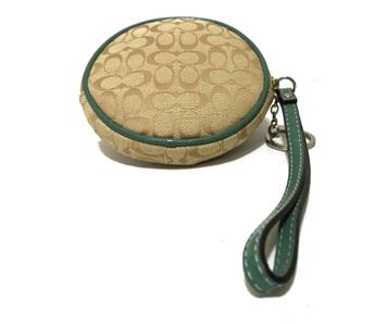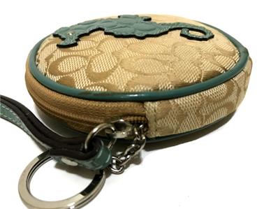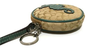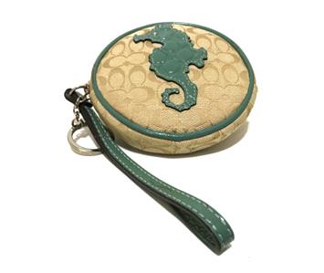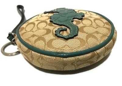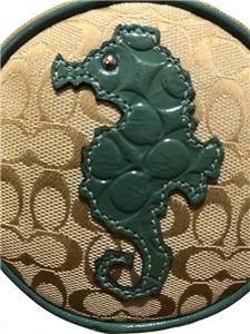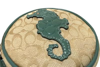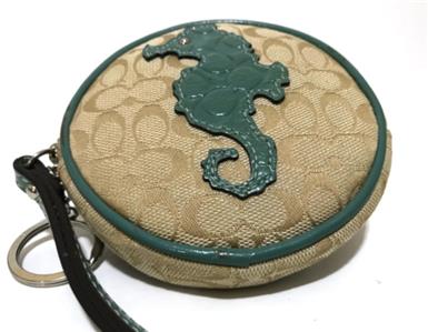 Up for your consideration Coach's ADORABLE AND ICONIC Signature C Seahorse Round Coin Purse Mini Wristlet. Beautifully crafted with famous Jacquard Fabric C's with patent Juniper Green Leather trim accented with large SEAHORSE on the front made of patent embossed C's with silver round eyes, Absolutely CUTE & FABULOUS! It has a keyring inside for keys and for attachement if you want to hang rhis on your bag. Really AWESOME! This is DISCONTINUED and getting hard to find especially in this excellent condition. Please see Photos for other details.