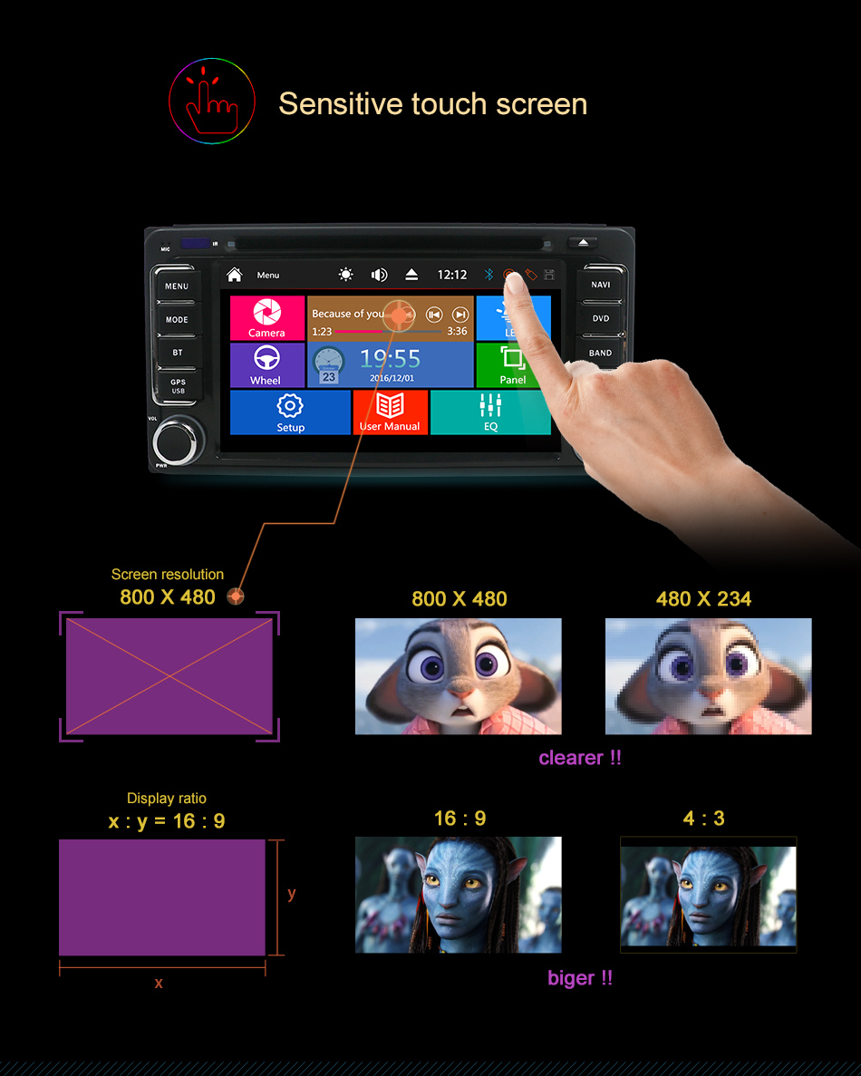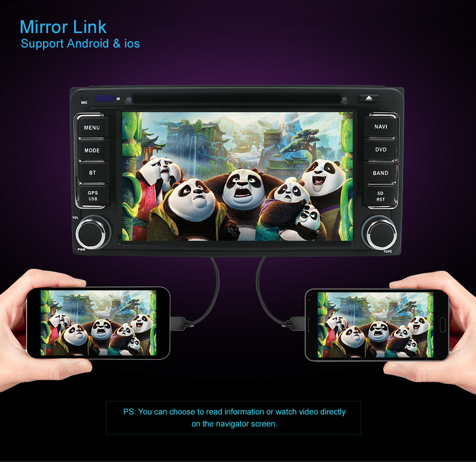 ●Mirror Link:Support Android phones and Iphones, it can be mirrorred and controlled directly on the unit via USB cable connectionl.