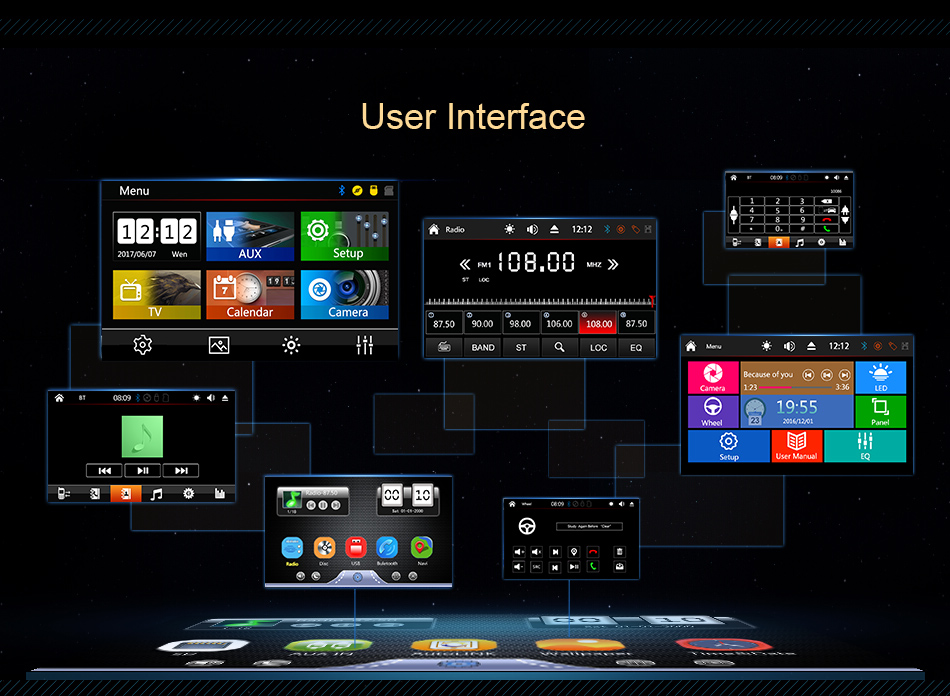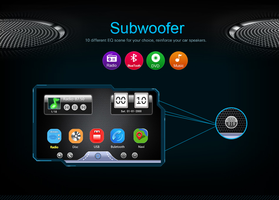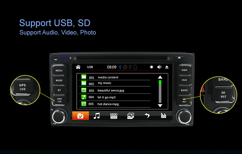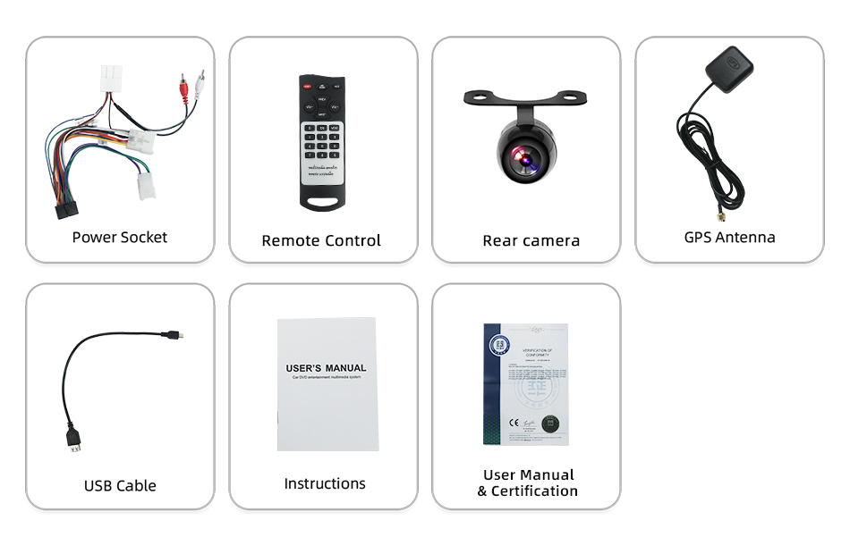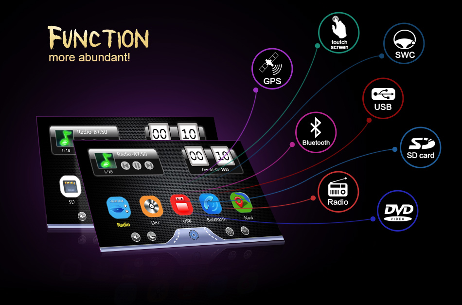 ●Radio: FM Frequency Range: 87.5-108MHz.Supports automatic station search and the radio stations can be stored. ●USB: supports USB flash drive and Micro SD card,can be connected with Media/Camera/DAB+ Box/Smartphone