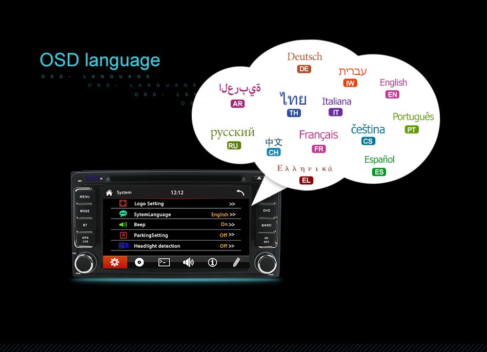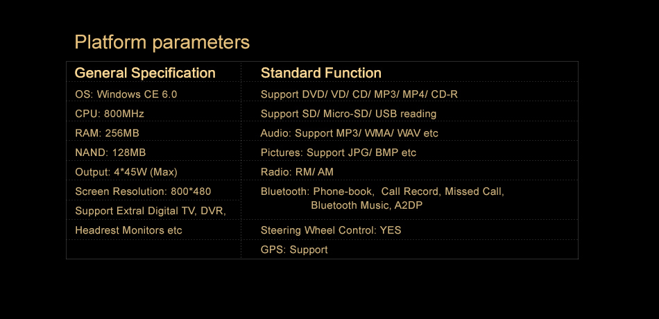 ●Reverse Camera:Support rear camera input, automatically switch to rear camera when reverse the car ●Surround Stereo Out: 4*45w ●Languages and Input: more than 18 Languages and choose input method