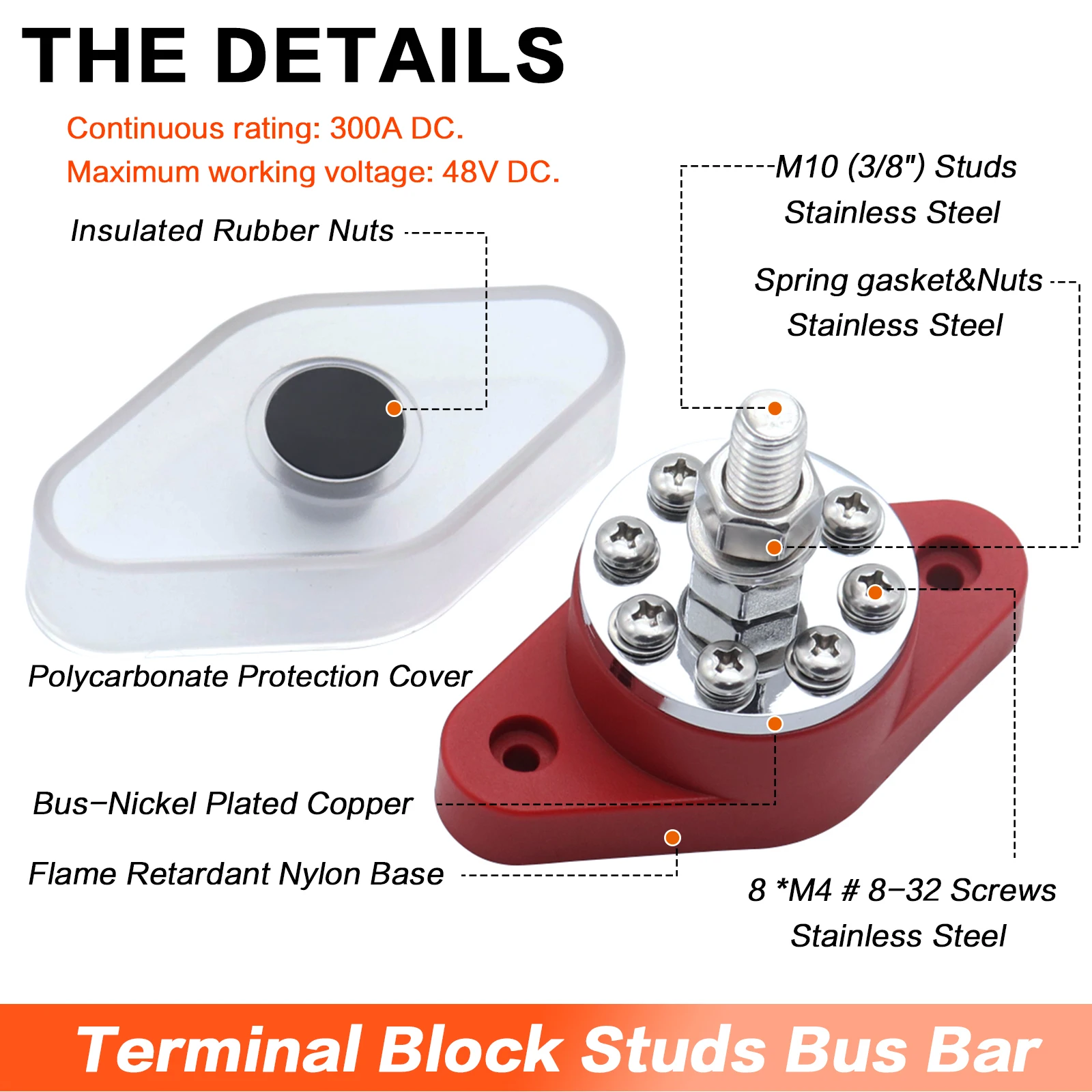 2pcs 300A Heavy Duty Bus Bar M10 Terminal Block Stud 8X#8-32 Screws for Positive Negative Battery Power Junction Post Buss Bar Kit in Red and Black