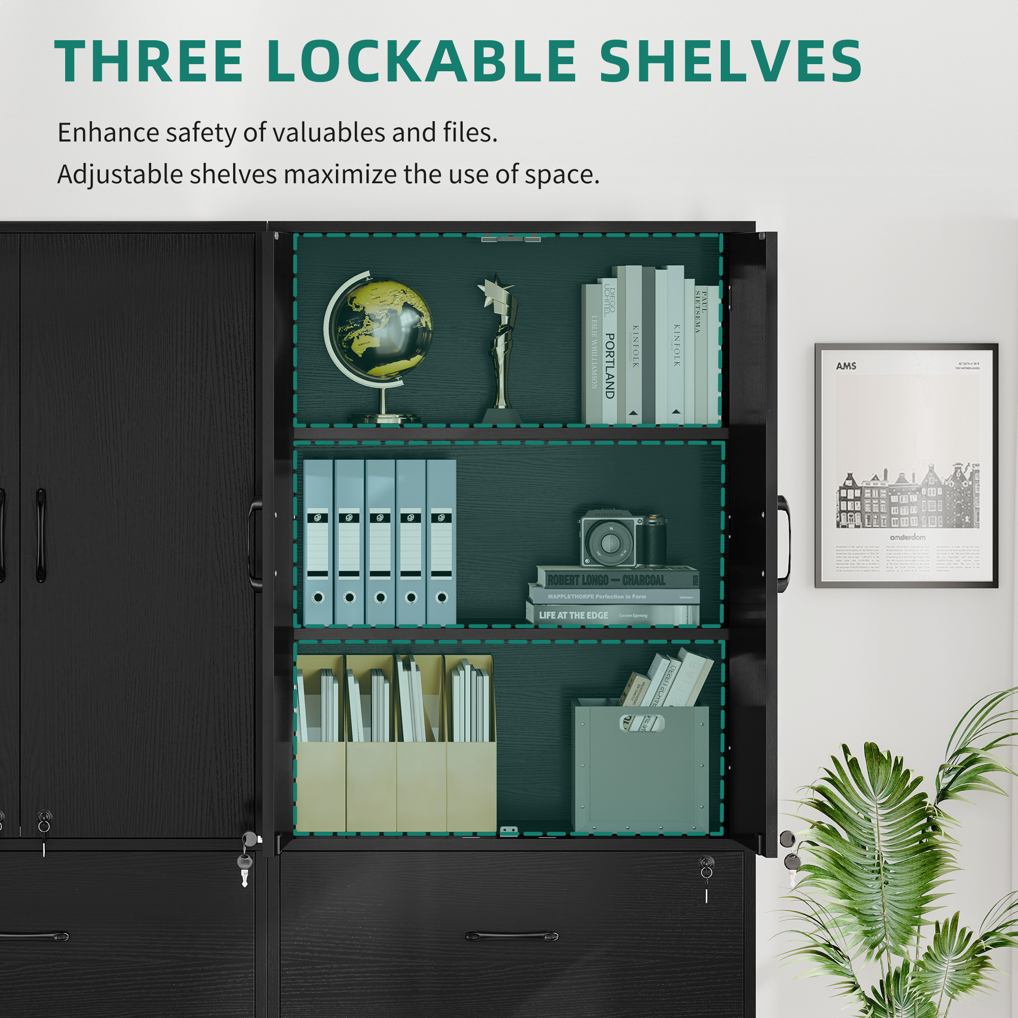 Constructed with thick MDF wooden board, this office storage cabinet is solid and can hold up to 110lbs. Additionally, it features an anti-tip metal buckle that allows you to secure it to the wall, providing added stability.