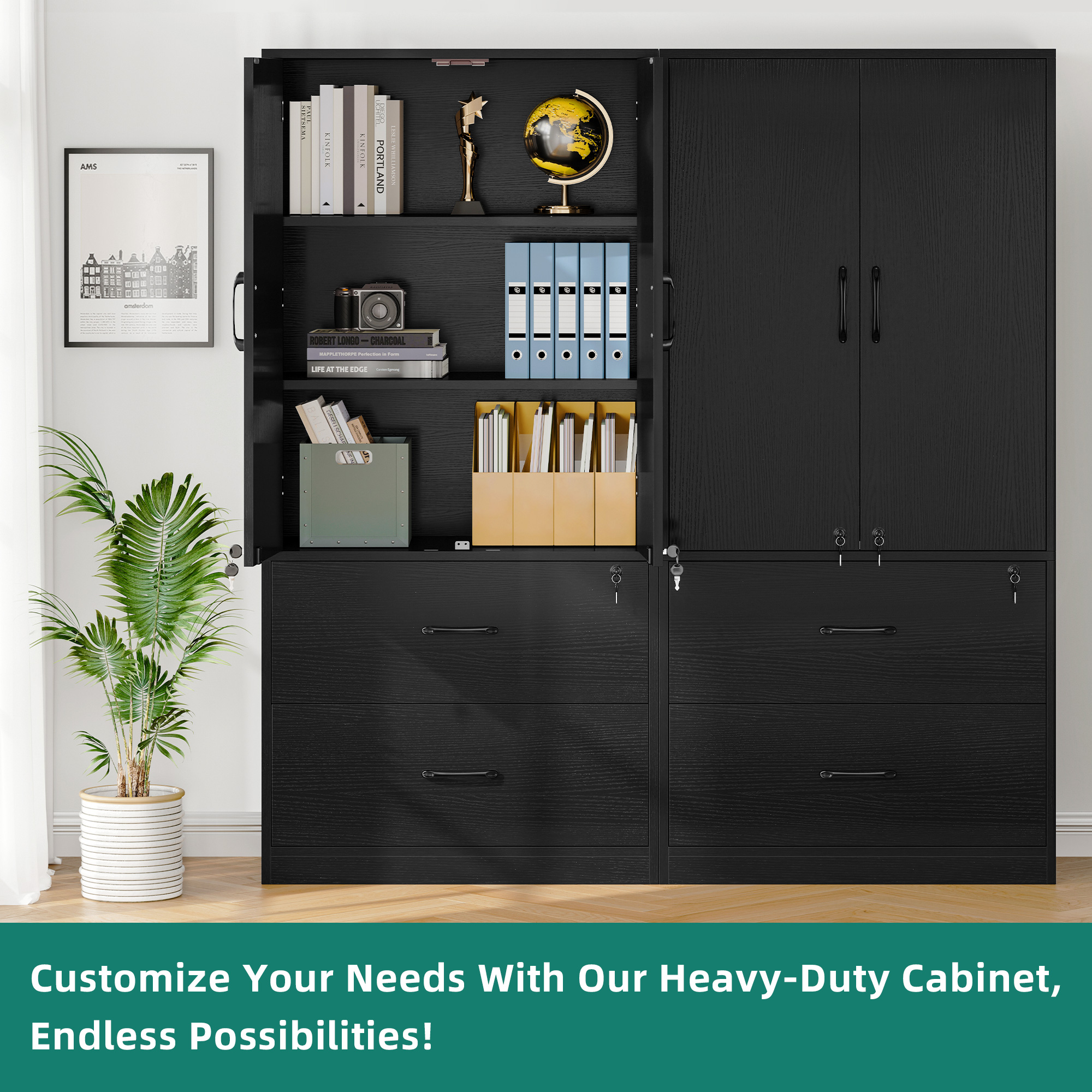The bottom drawer of this mobile lateral storage cabinet is equipped with removable hanging bars. This allows you to conveniently store A4 Letter and Legal documents, and the drawer can be locked for added security.
