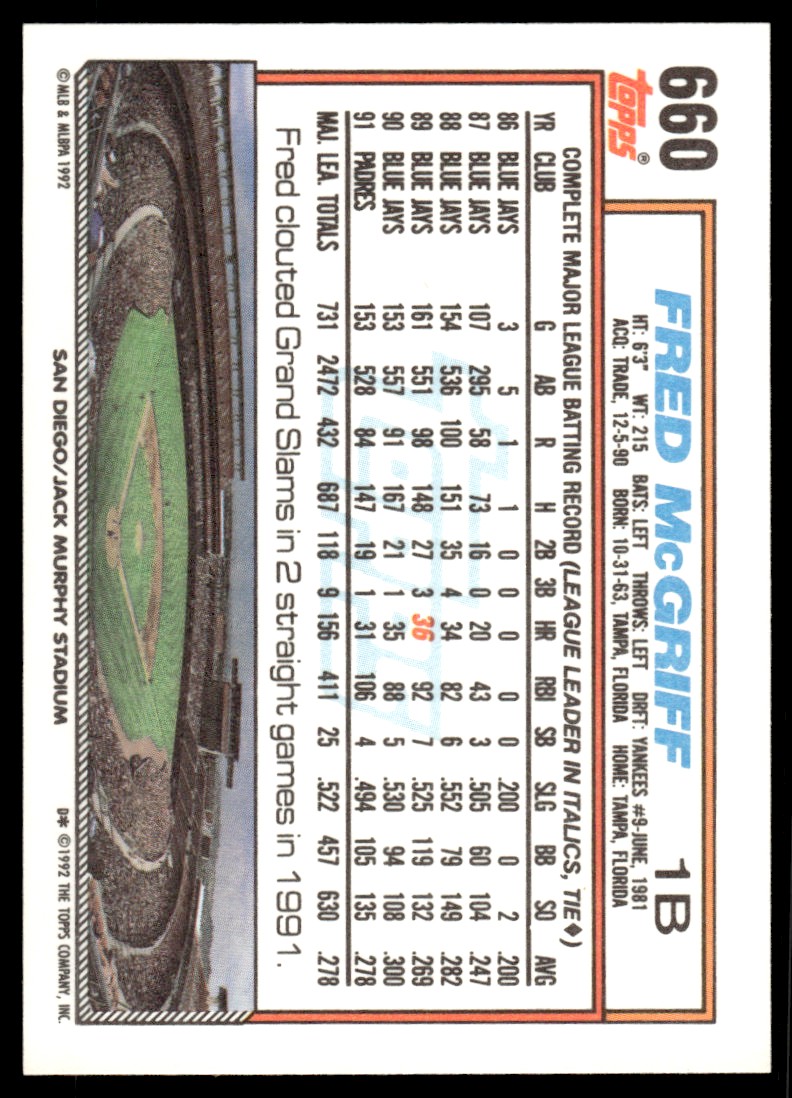 | Description: | Fred McGriff | | Category: | Baseball | | Year: | 1992 | | Product: | Topps Baseball Card | | Team: | San Diego Padres | | Card Number: | 660 | | Dimensions: | 3½" x 2½" |