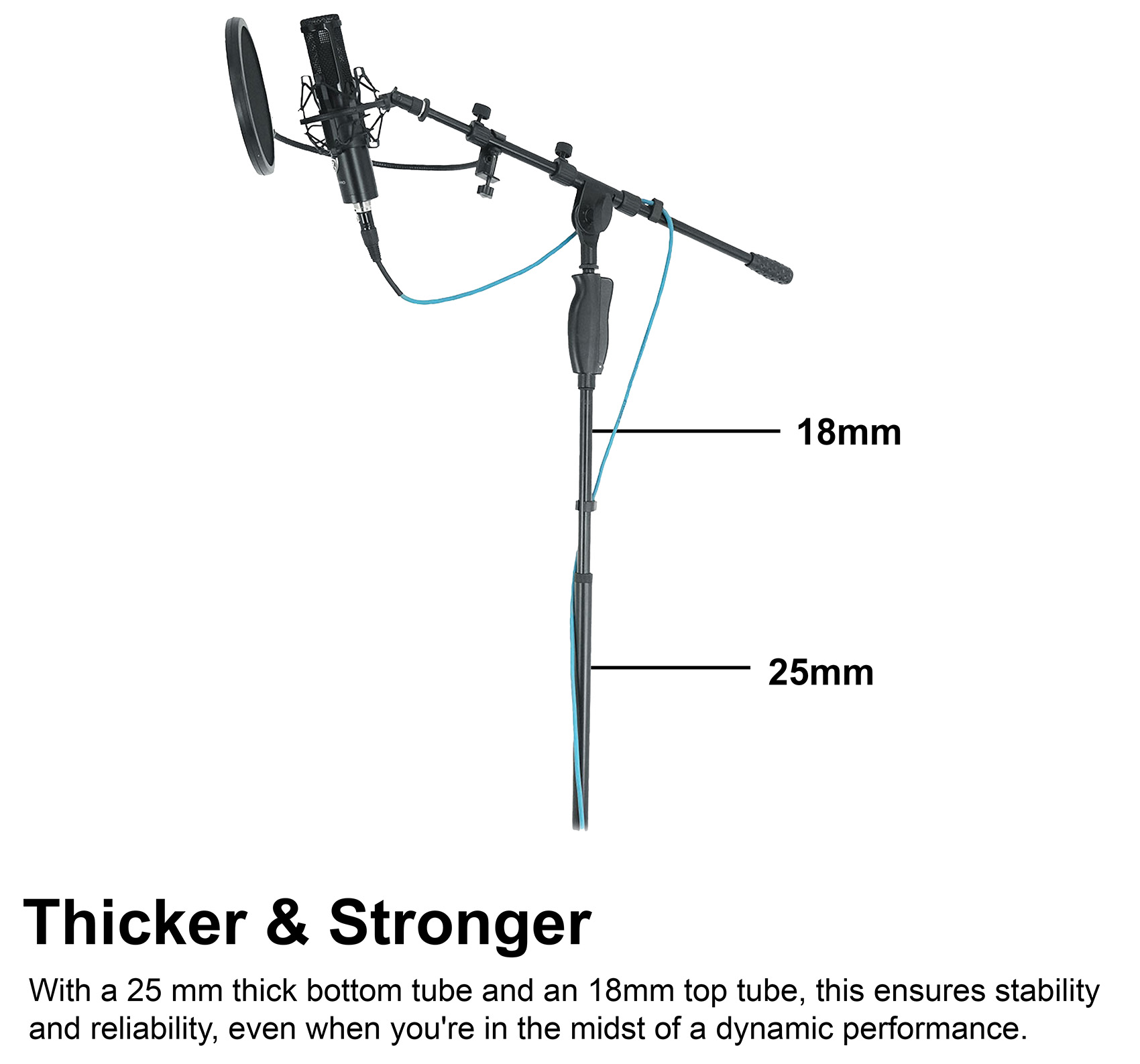 Our stand tubes are no slouch either, with a 25 mm thick bottom tube and an 18mm top tube, thicker than the competition. This ensures stability and reliability, even when you're in the midst of a dynamic performance.