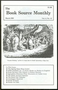 Book Source Monthly Magazine March 1989. Peasants Drinking on Cover. Articles include Book Reviews, Early Books on Mexico in English Checklist, and more. Good Condition, wear at edges.