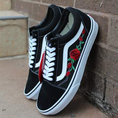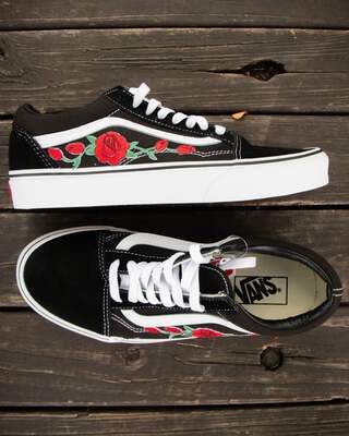 Vans Black Old Skool Red Rose Custom Chaussures faites à la main par Patch Collection