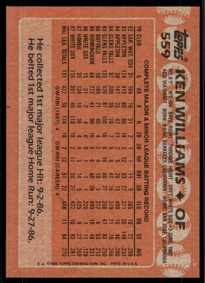| 1988 Topps Ken Williams Rookie Baseball Card Chicago White Sox #559 |
