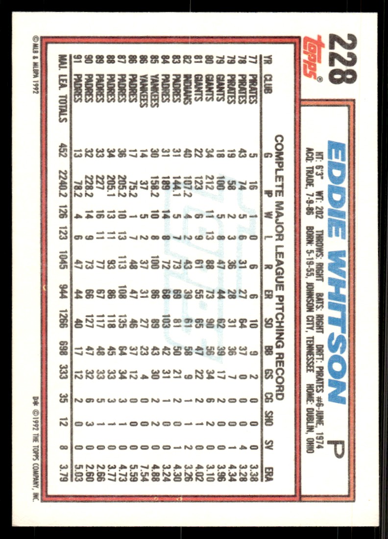 | 1992 Topps Eddie Whitson Baseball Card San Diego Padres #228 |