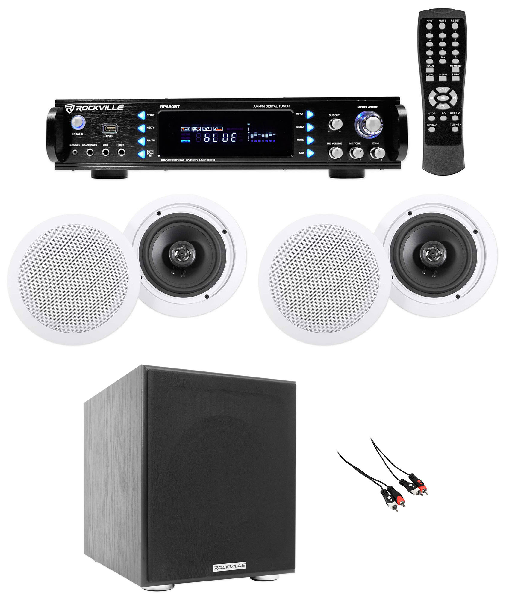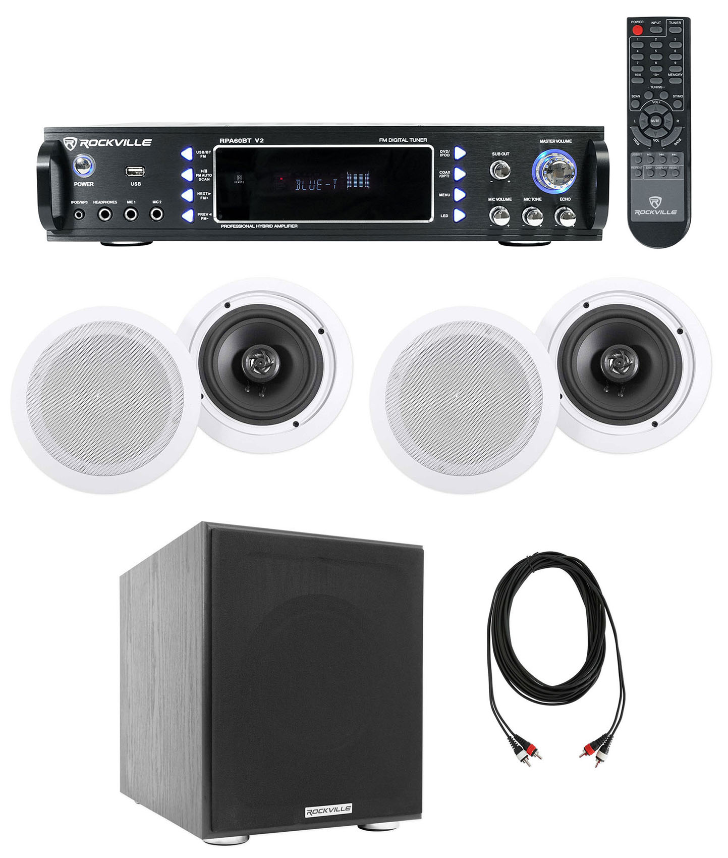 Package: Rockville RPA60BT V2 1000 Watt 2-Ch USB Bluetooth DJ/Pro/Karaoke Amplifier Mixer + (2) Pair of Rockville HC655 6.5" 500 Watt In-Ceiling Home Theater Speakers + Rockville RCDR25B 25' Ft. Dual RCA to Dual RCA Pro Audio Cable 100% Copper + Rockville Rock Shaker 8" Inch Black 400w Powered Home Theater Subwoofer Sub