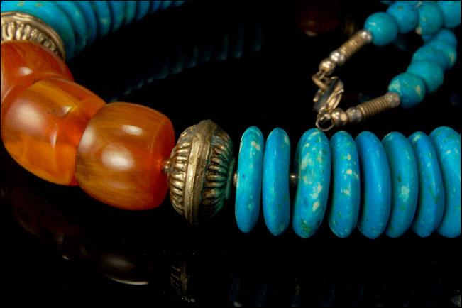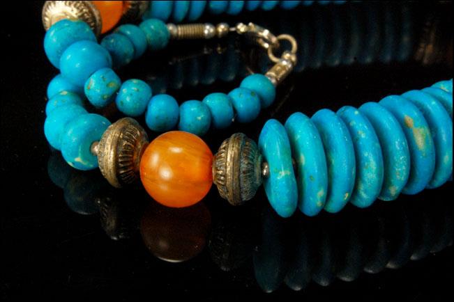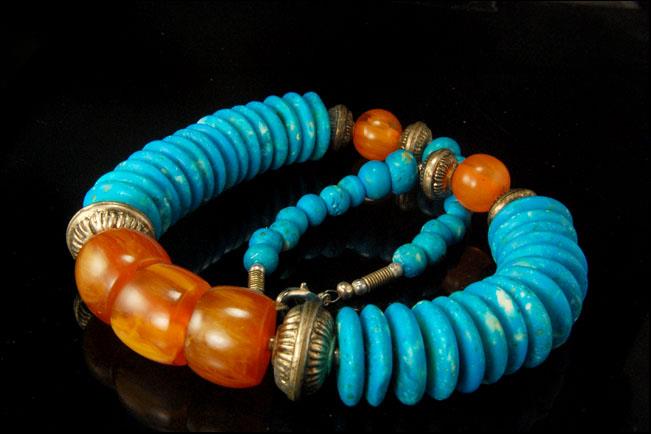 This is a very beautiful, vintage and unique TIBETAN BAKELITE BEADS SILVER TONE c. 1940 necklace. The necklace has a marvelous amber bakelite beads, silver tone metal beads and clasp, turquoise color beads. The necklace has antiquated and exquisite feel to it. It measures 18 1/2 x 3/4". The necklace is in very good condition.