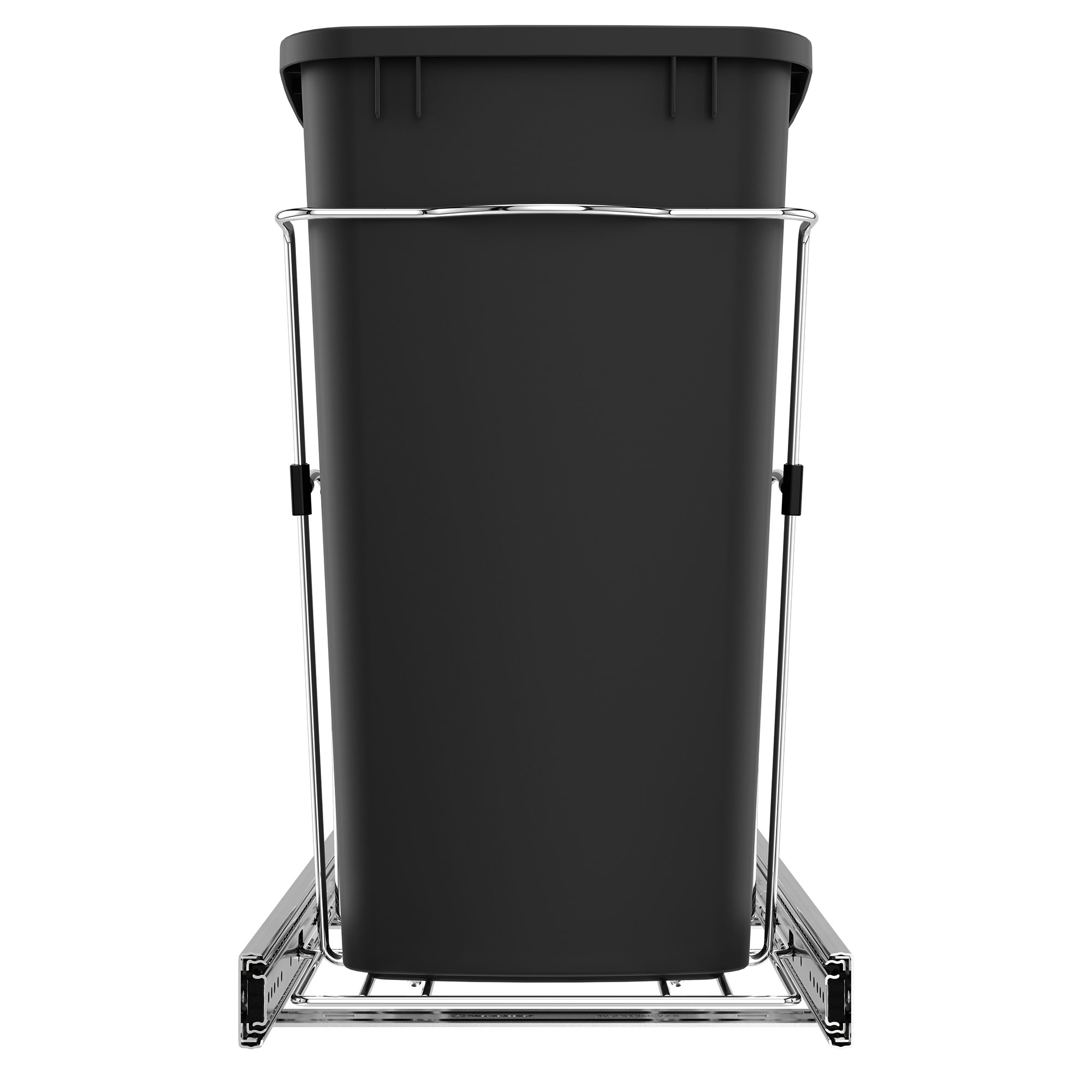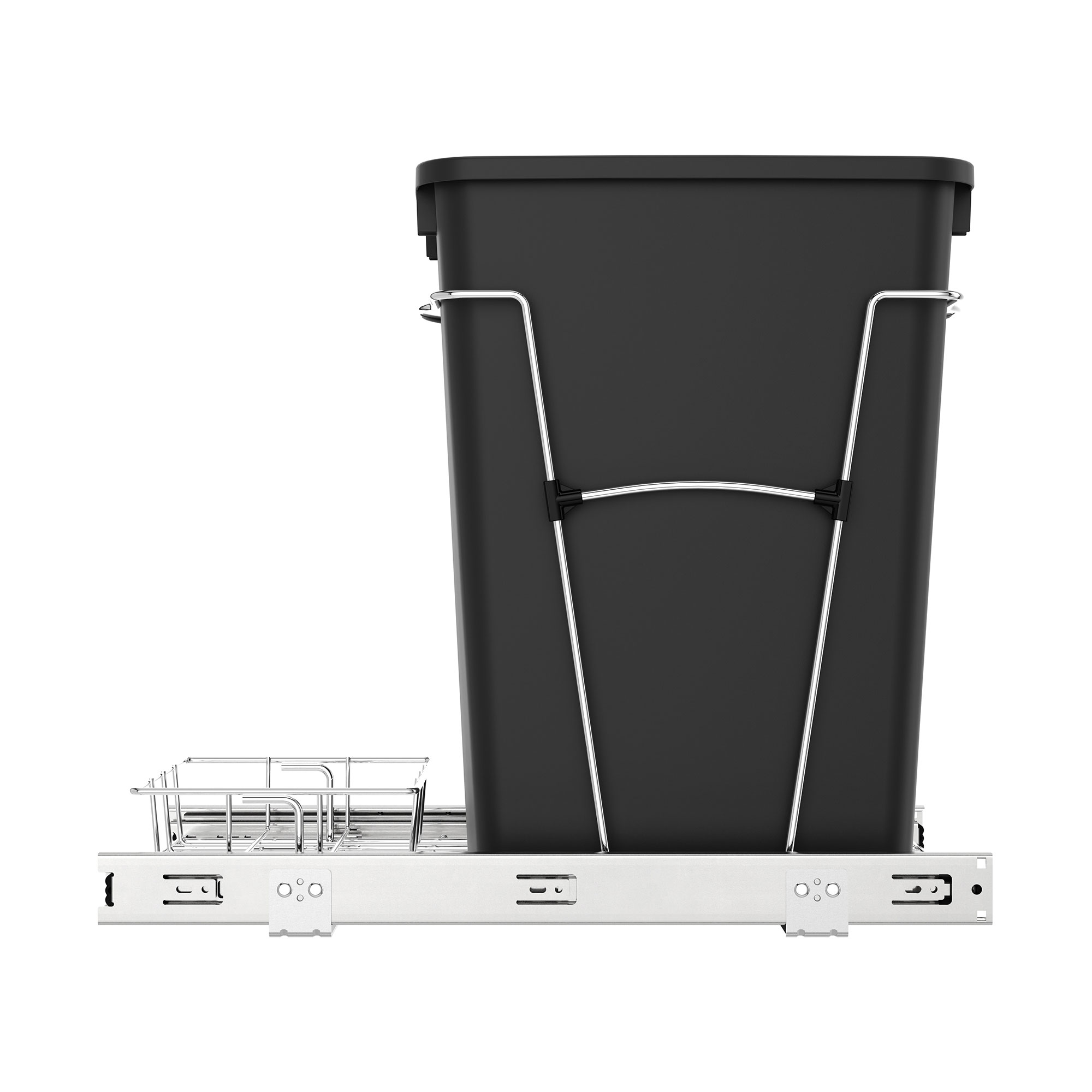 Once installation is complete, this sliding trash container glides effortlessly on a 3-piece zinc plated full-extension ball-bearing slide system. This pullout bin uses a standard 12-gallon trash bag and has a rear basket for extra storage that can be removed to reduce the overall depth to 18-inches. Designed for a 15” base cabinet with an opening width of 11.5” or wider. The heavy gage plated metal wire construction ensures that this pullout system will last for years to come.