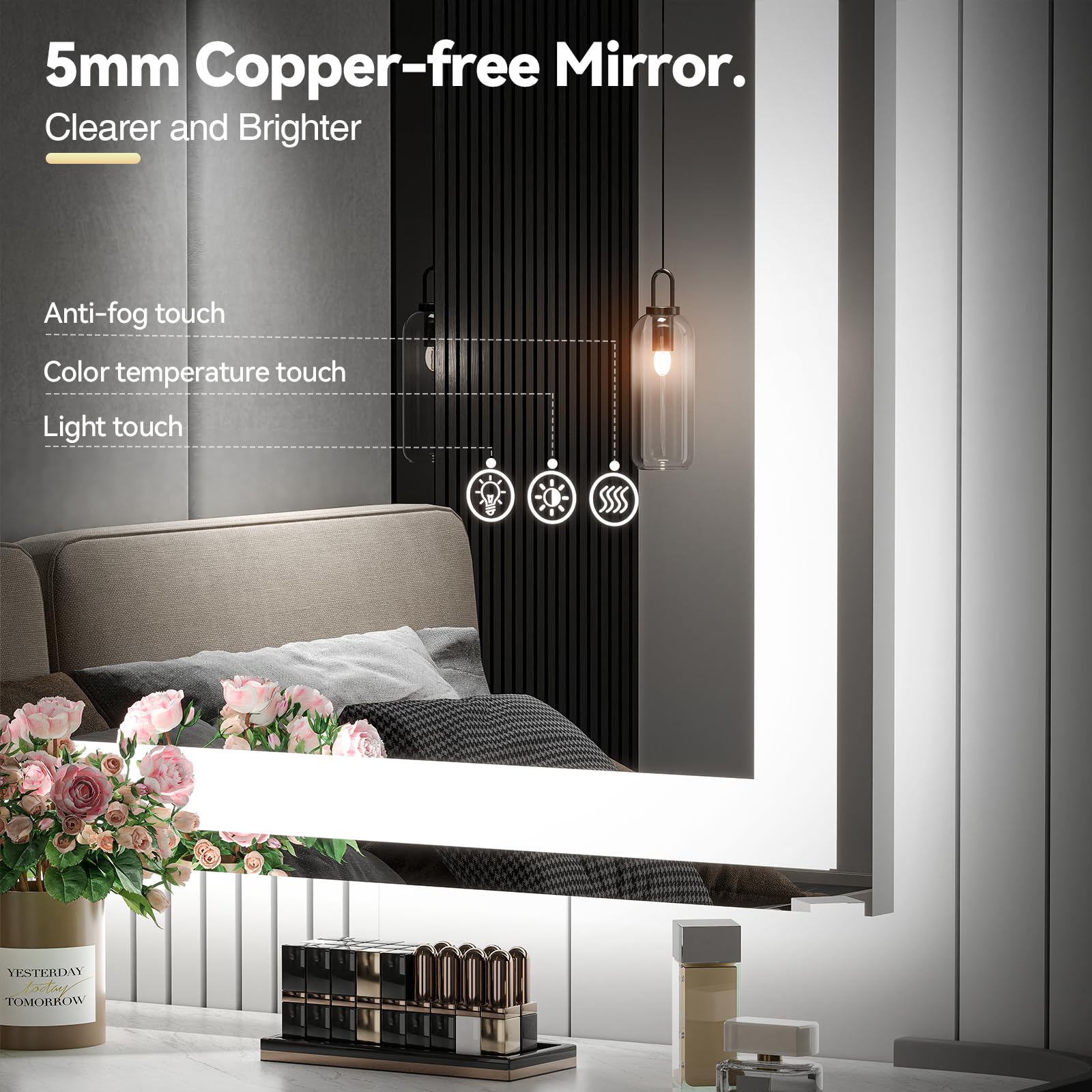 【Dimmable & 3 Color Temperature Vanity Mirror】The versatile LED bathroom mirror is designed to meet all your needs. With its dimmable feature and adjustable color temperature, it offers a customizable lighting experience. With just a simple long press of the touch switch, you can effortlessly adjust the brightness simultaneously. Choose from 3 color temperature settings - 3000K Warm White, 4000K Natural Light, & 6000K Day Light - each with adjustable brightness levels ranging from 10% to 100%.