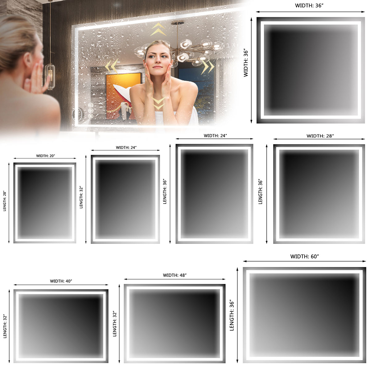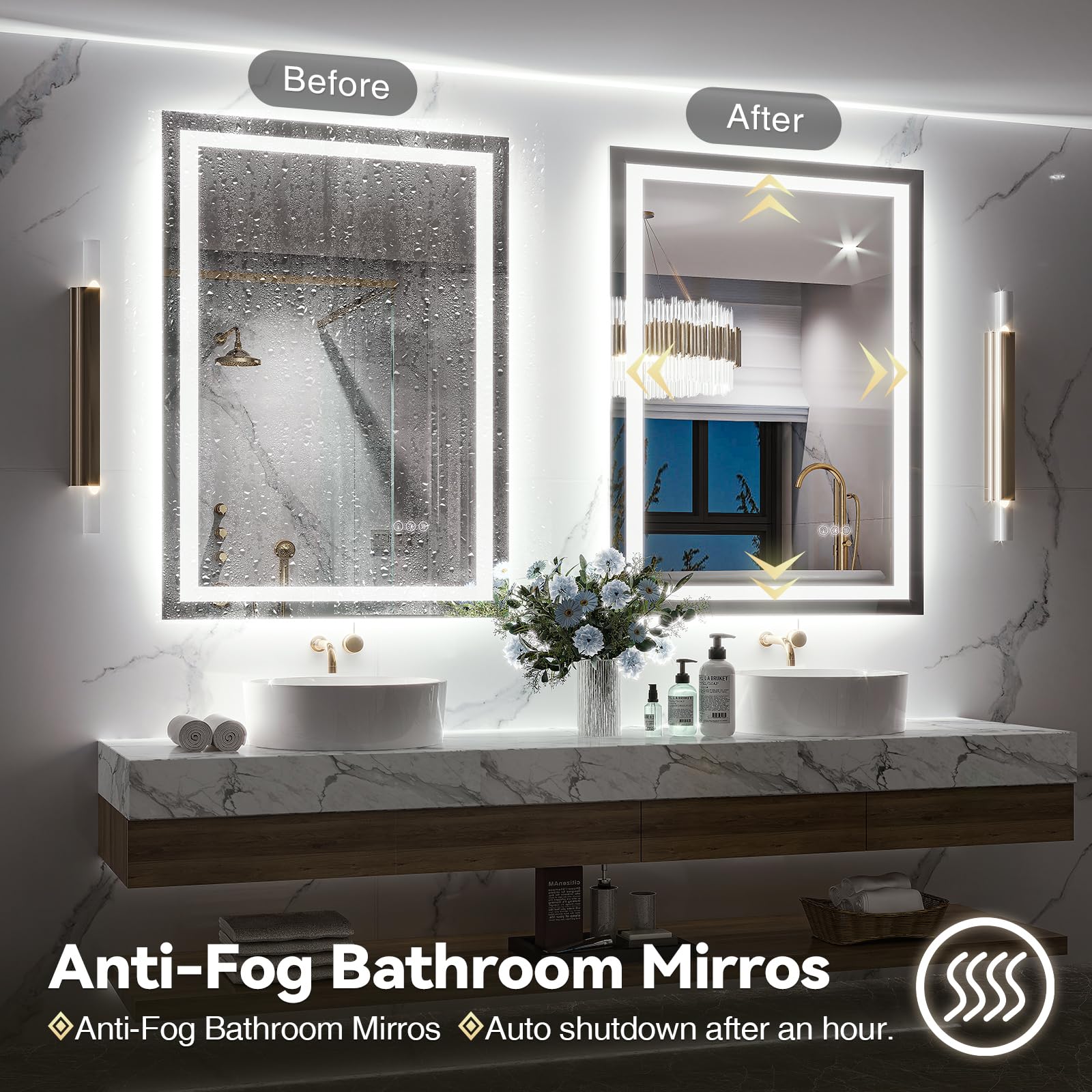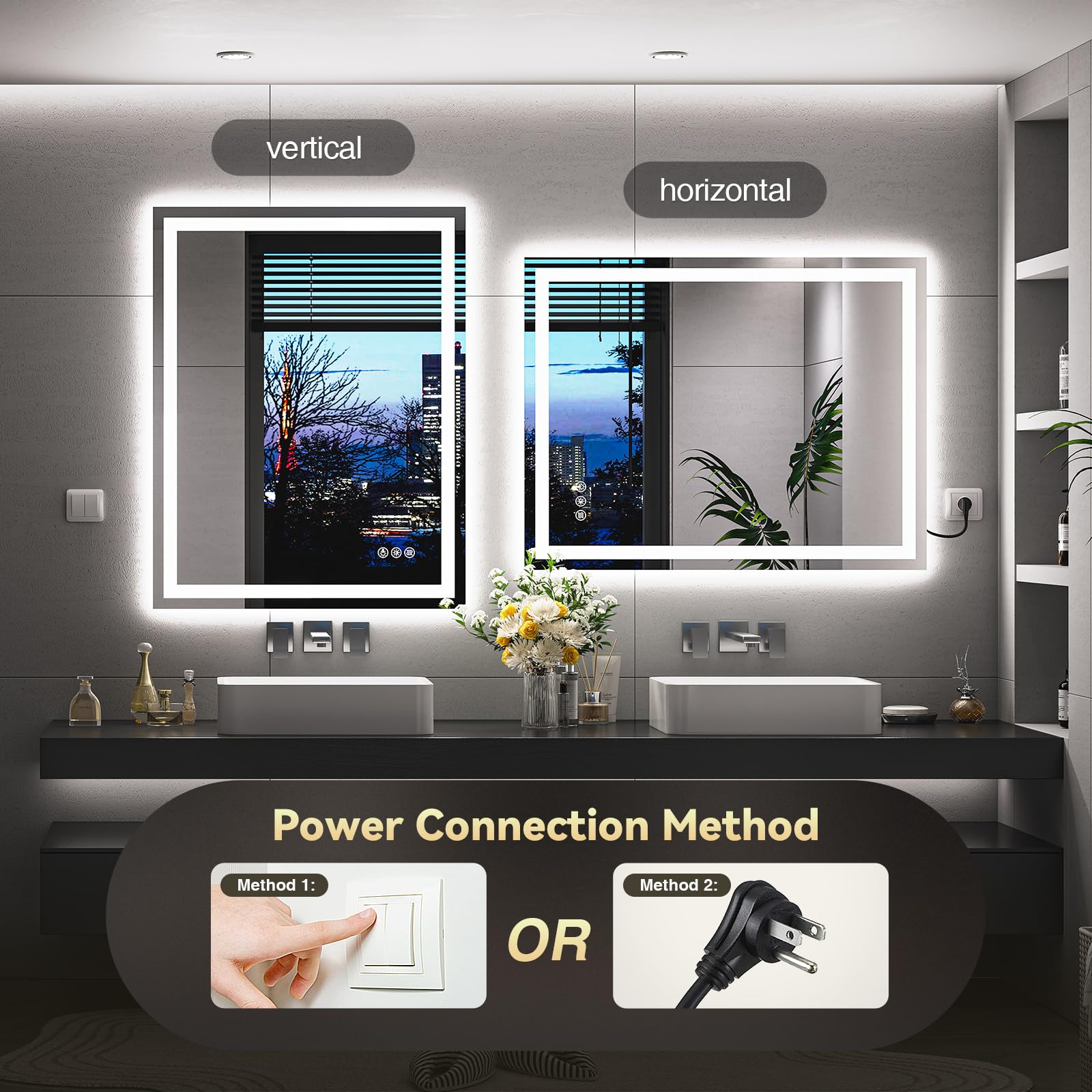 【Anti-fog Function LED Mirror】Never worry about fogged-up mirrors after a steamy shower with the incredible mirror with lights. It is designed to heat up the bathroom mirror and prevent moisture buildup, ensuring a clear reflection that lasts. Activate the defogger before showering for a clear mirror or turn it on after showering to swiftly eliminate any water vapor. It automatically shuts off after 60 minutes for energy saving. The switch allow for manual control.