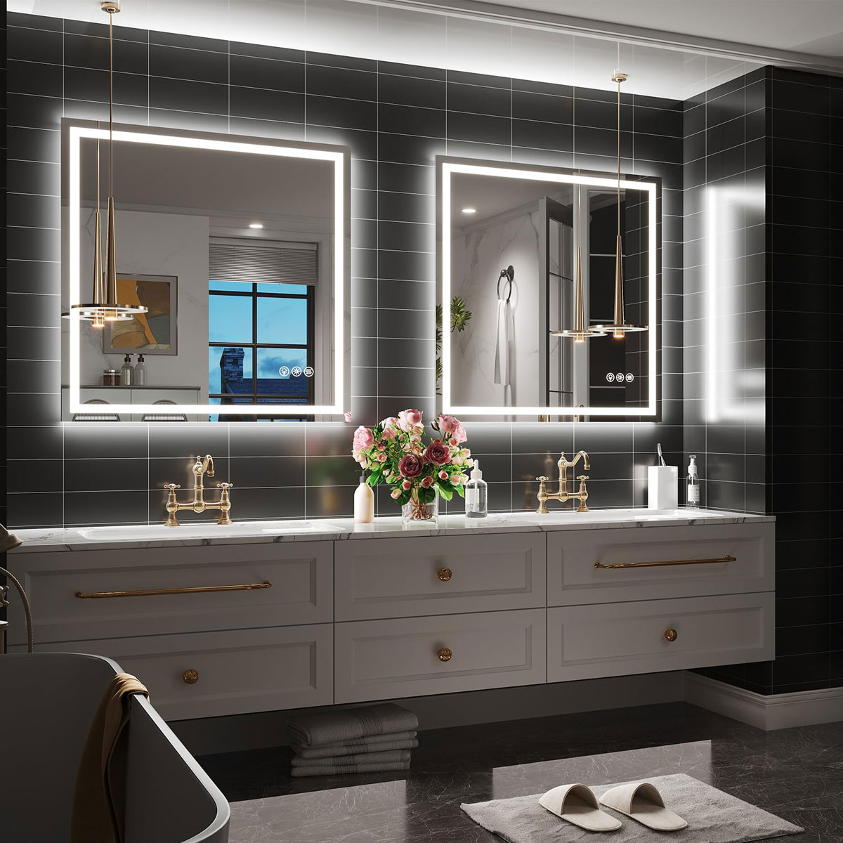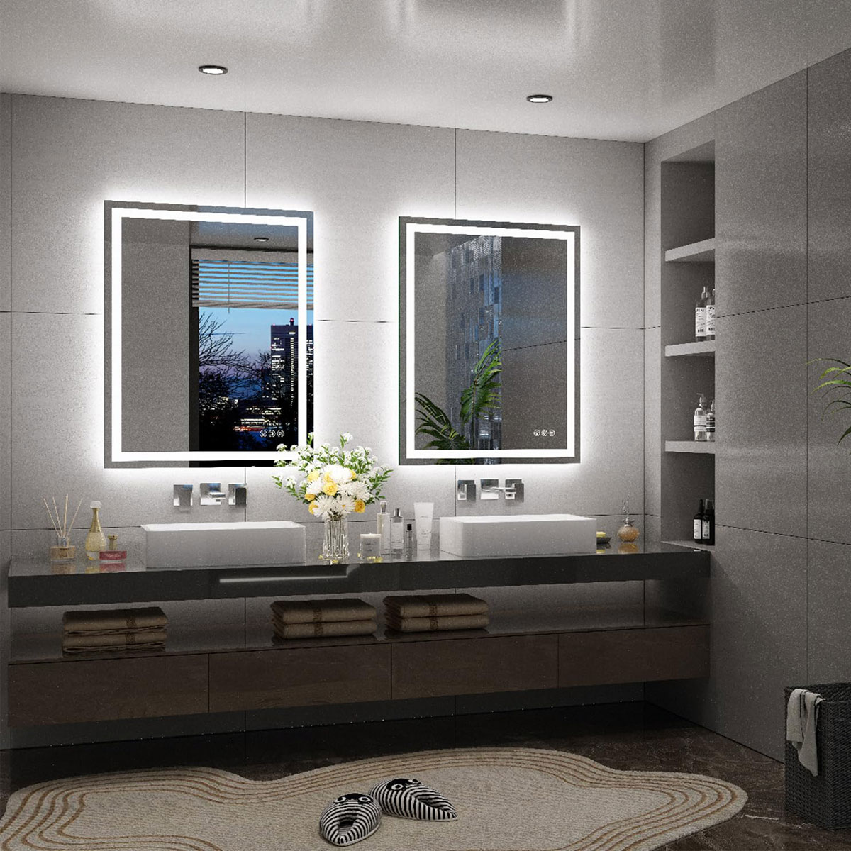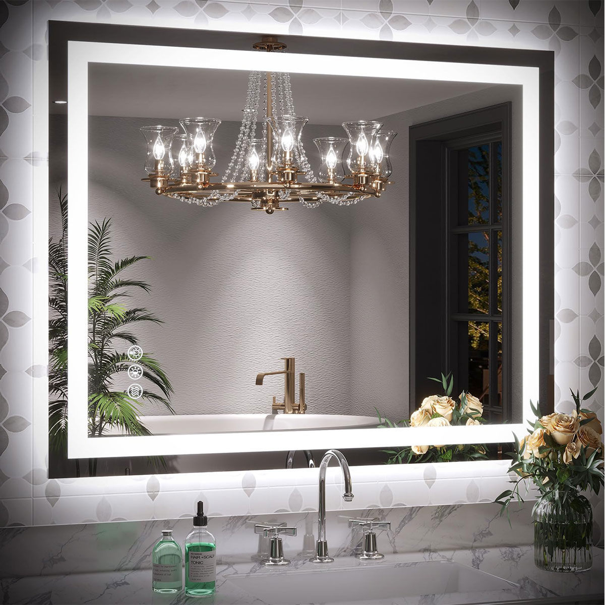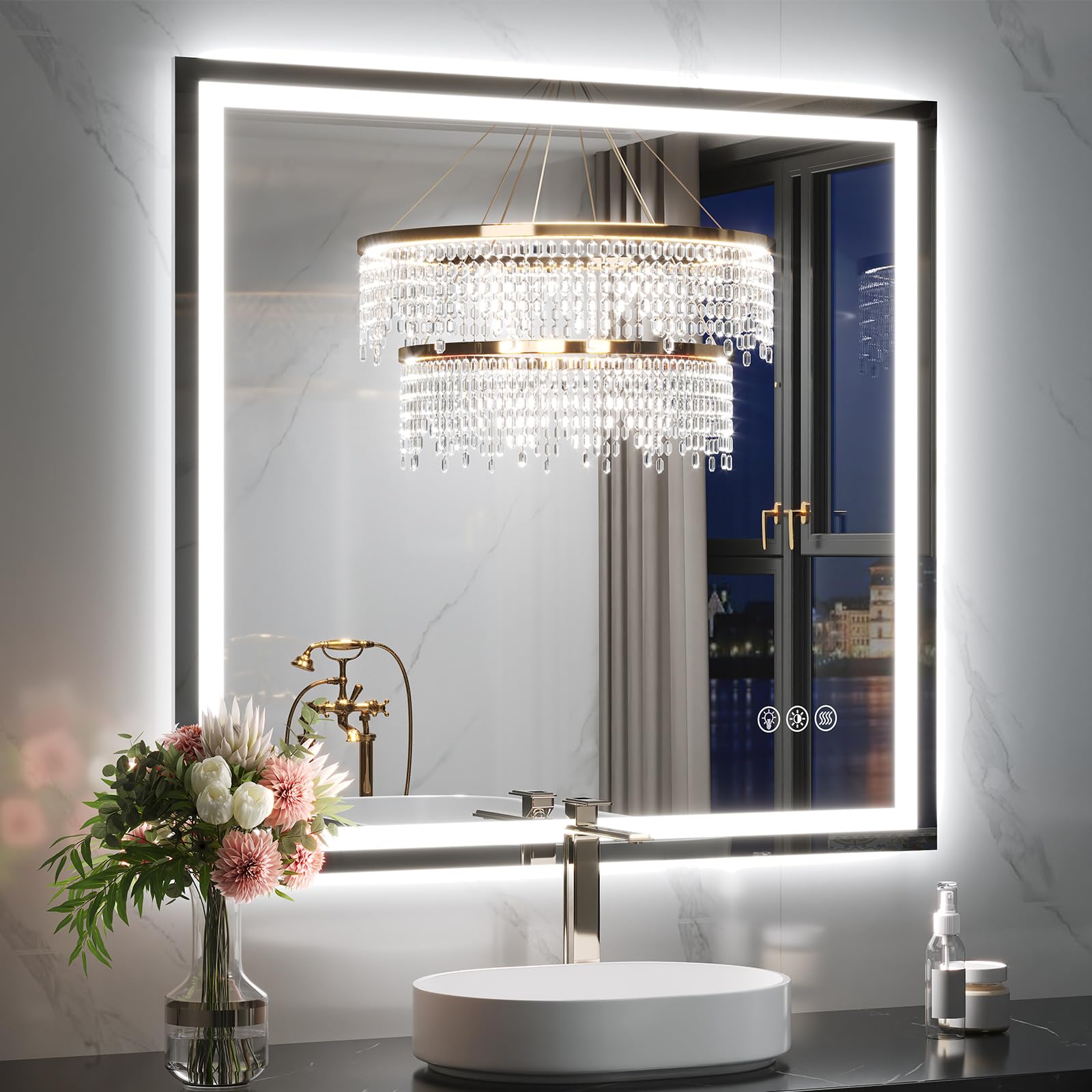 【Anti-fog Function LED Mirror】Never worry about fogged-up mirrors after a steamy shower with the incredible mirror with lights. It is designed to heat up the bathroom mirror and prevent moisture buildup, ensuring a clear reflection that lasts. Activate the defogger before showering for a clear mirror or turn it on after showering to swiftly eliminate any water vapor. It automatically shuts off after 60 minutes for energy saving. The switch allow for manual control.