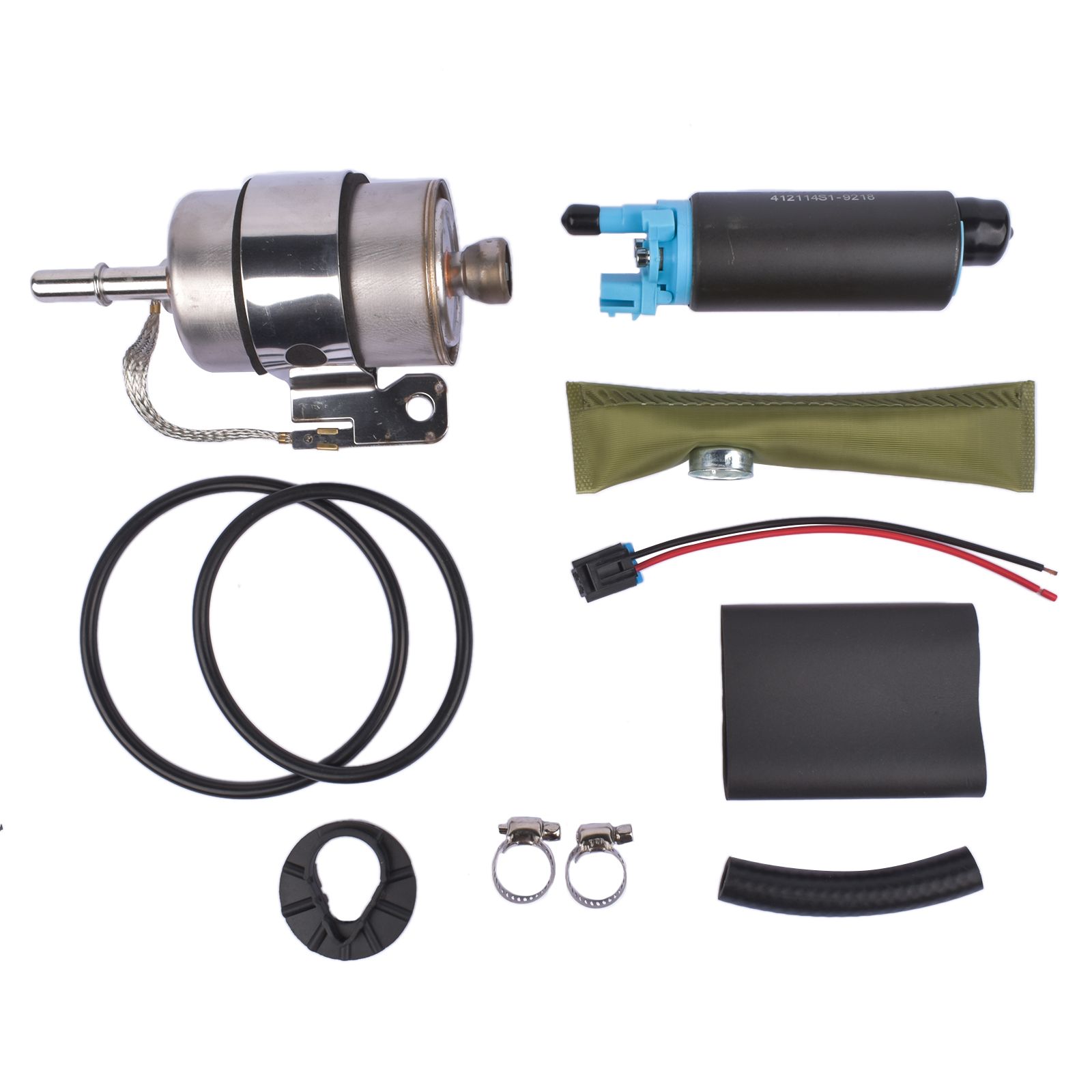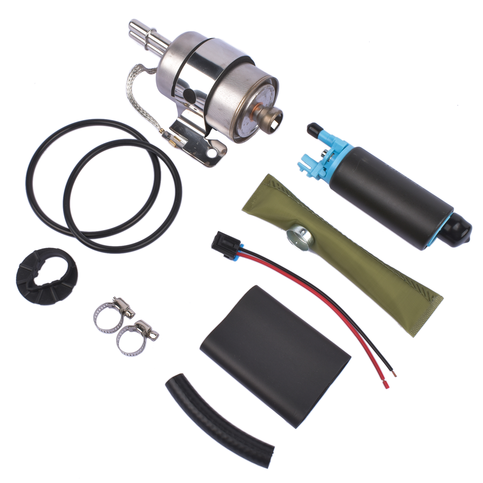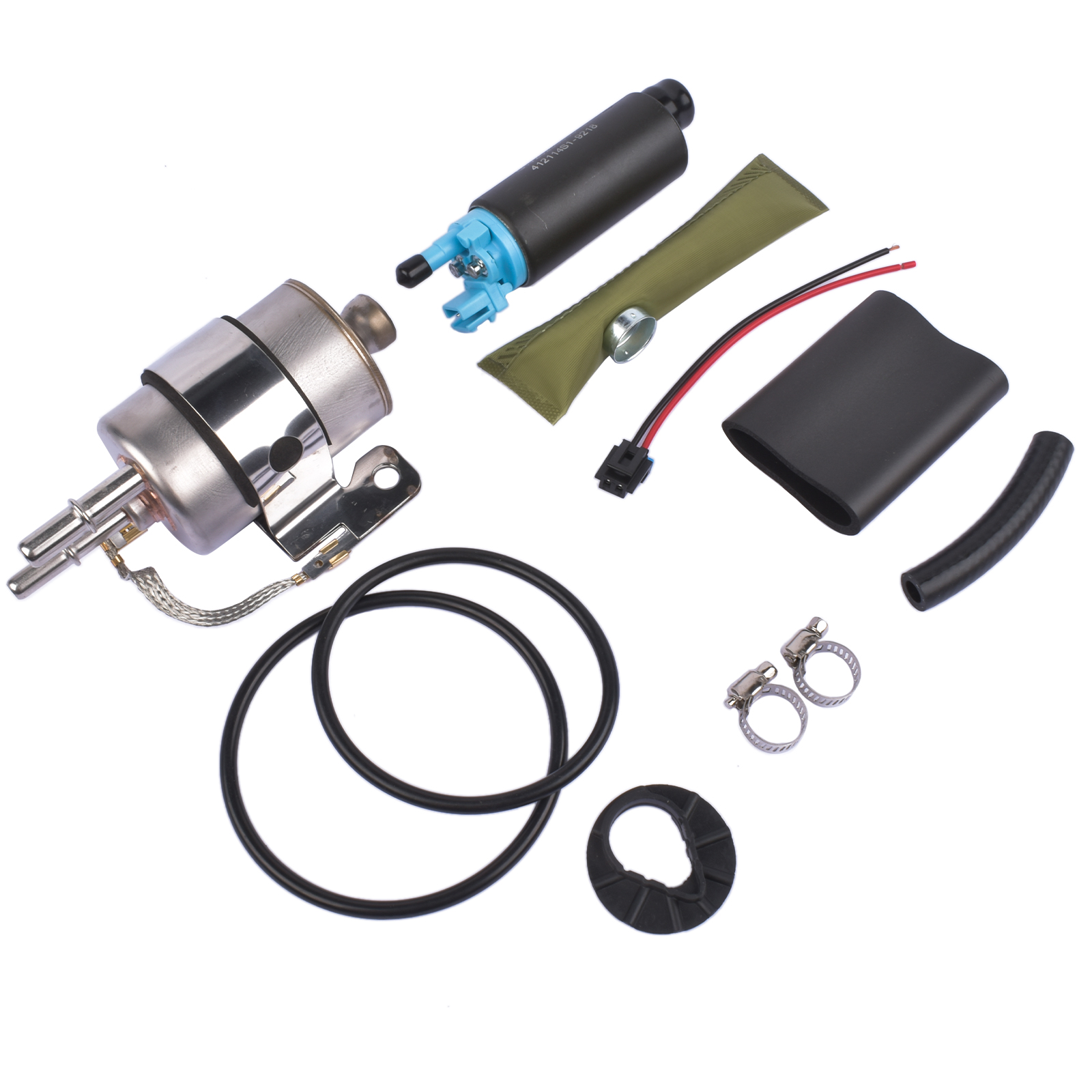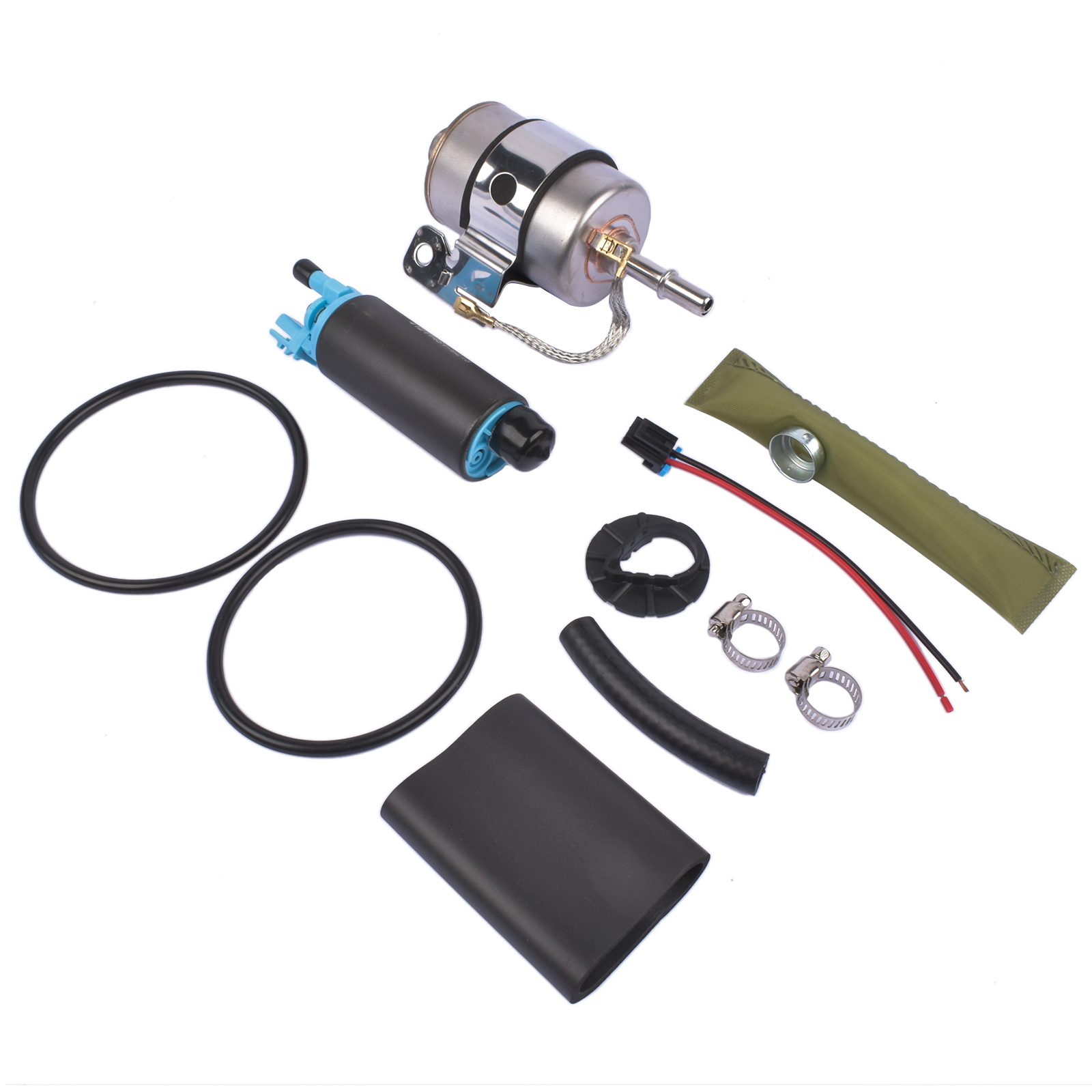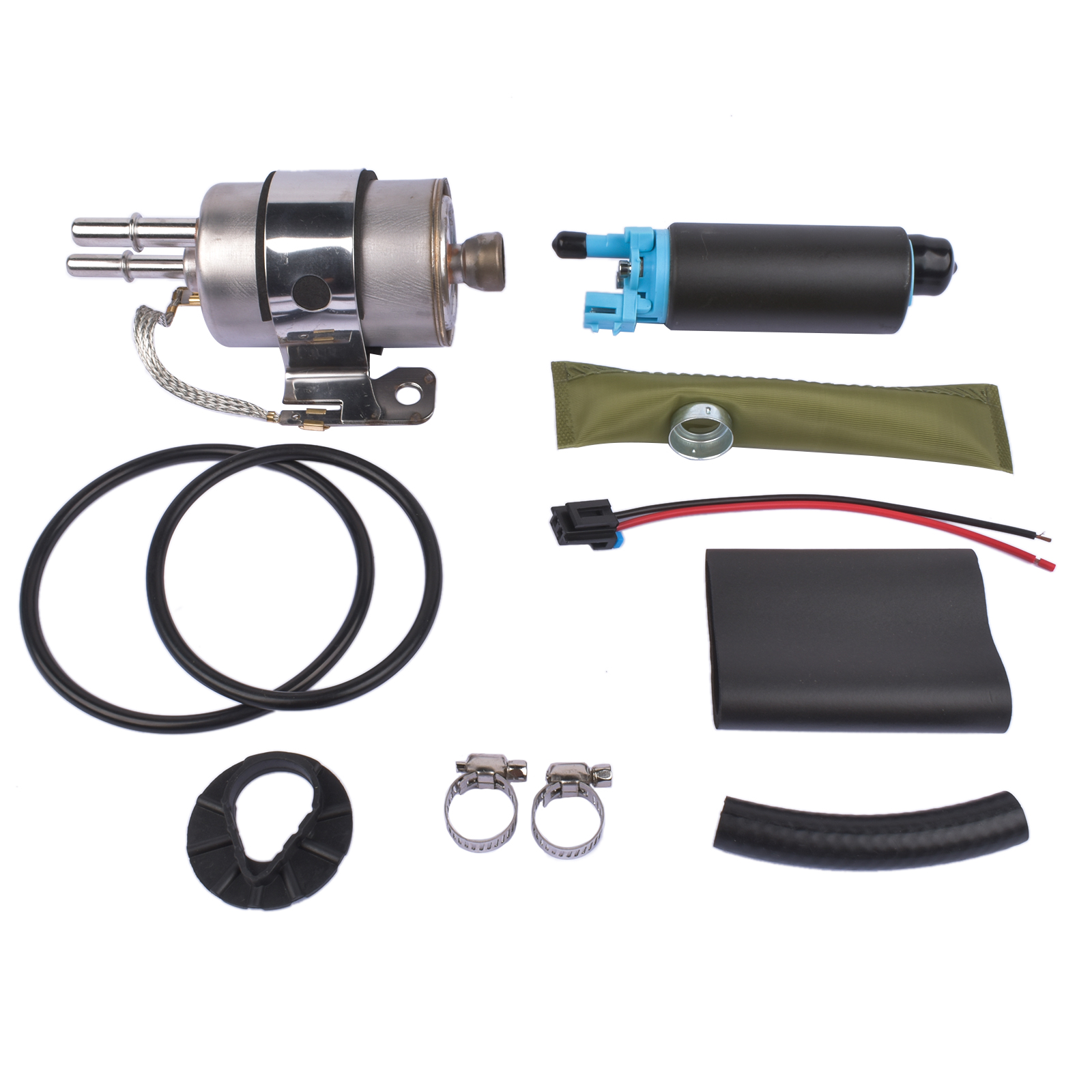 Includes: Pump, Fuel Filter, Strainer, Tank Seals, Clamps (all items shown)