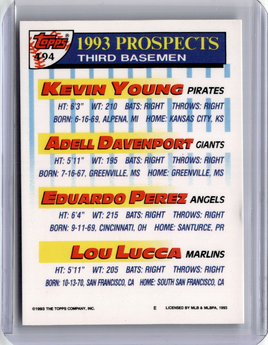 | 1993 Topps Kevin Young/Adell Davenport/Eduardo Perez/Lou Lucca Baseball Card |