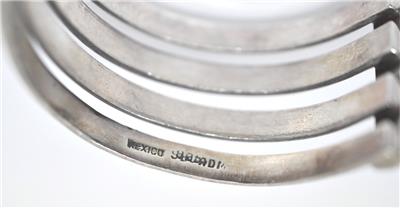 Women's vintage designer signed Mexican modernist wide cuff bracelet crafted of sterling silver having a four band wire design.