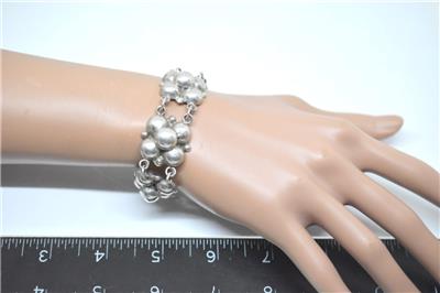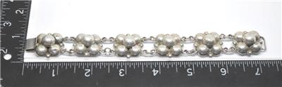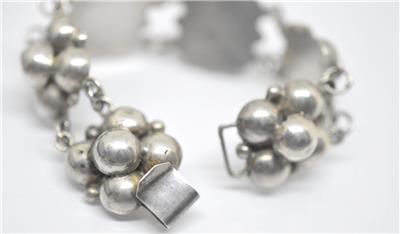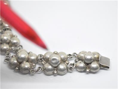 Vintage women's estate bracelet crafted of Mexican silver having a hollow puffy beaded modernist design resembling flowers. Completed with hook clasp.
