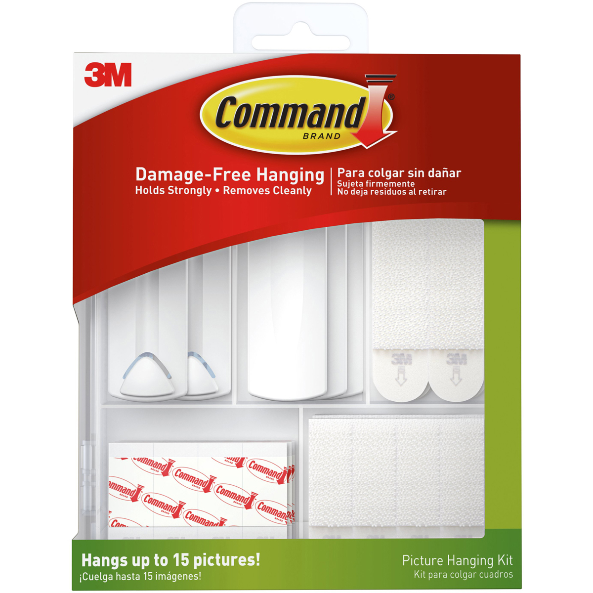 Finish: *Hardware Included: Yes *Hook Type: *Installation Type: Adhesive *Length: 7-1/8 *Material: Foam *Number in Package: 38 *Packaging Type: Carded *Product Type: Picture Hanging Kit *Brand Name: 3M *Sub Brand: Command *Wire Length: *Capacity: 5 *Color: White *Height: *Width: Damage free hanging *Holds strongly