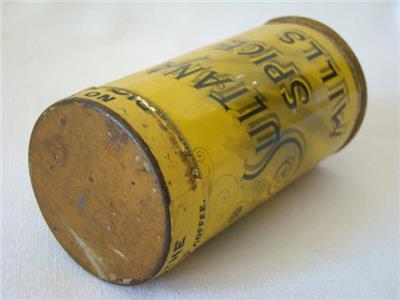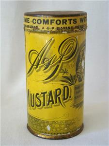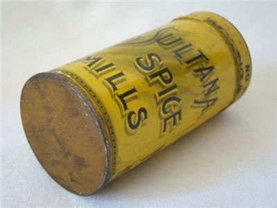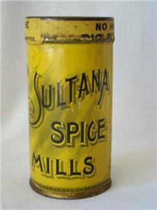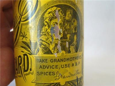 Wonderful antique A&P SULTANA SPICE MILLS Mustard advertising tin measuring 4-1/8" tall and 2" wide. Lithograph decorated with the iconic Grandmother logo graphics, it is printed in a wonderful mustard color with japanned base and japanning on the original cap lid.