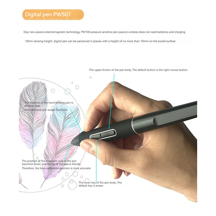 l Thanks to the new passive electromagnetic technology, the pressure-sensitive pen is passive and wireless, requiring no batteries or charging