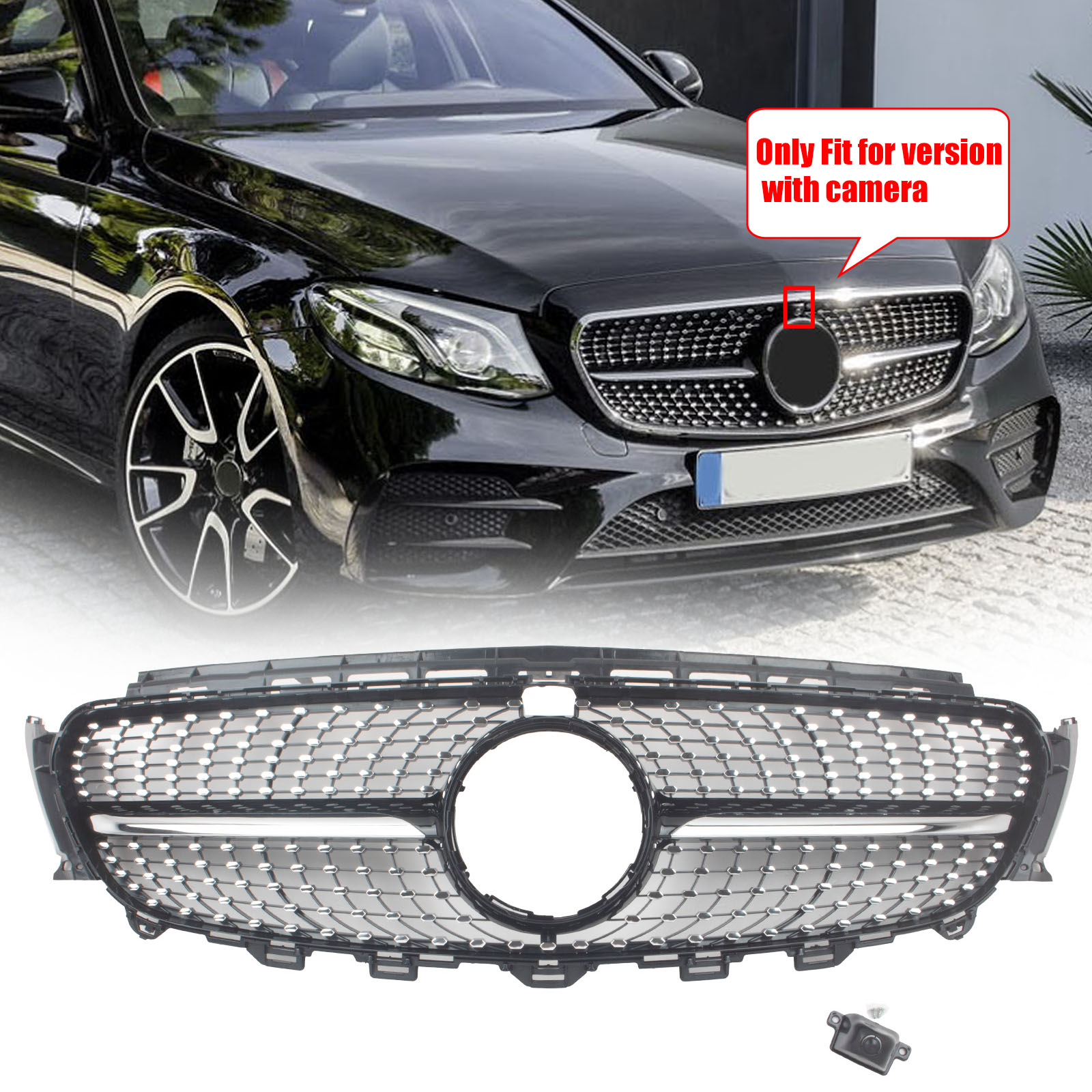 Front Bumper Grille For Mercedes Benz W213 E Class W/Camera Black Grill 2016-20
