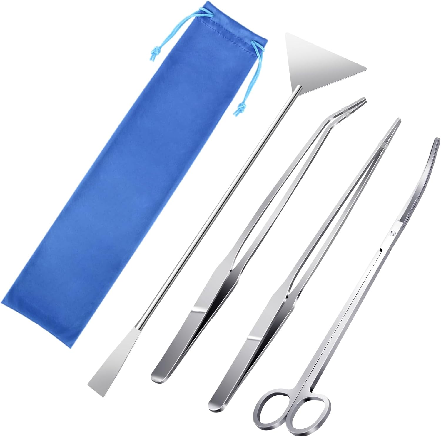 LONG ENOUGH: This 4-in-1 aquascaping tools kit that are long enough to easily use in fish tank under 10 gallon. 10.6'' Straight aquarium tweezer×1, 10.6'' curved long tweezers for aquarium×1, 9.7'' curved aquarium scissors for plants×1, 12.6'' aquascaping spatula×1. Makes trimming plants, moving plants around, smooth out substrate much easier.