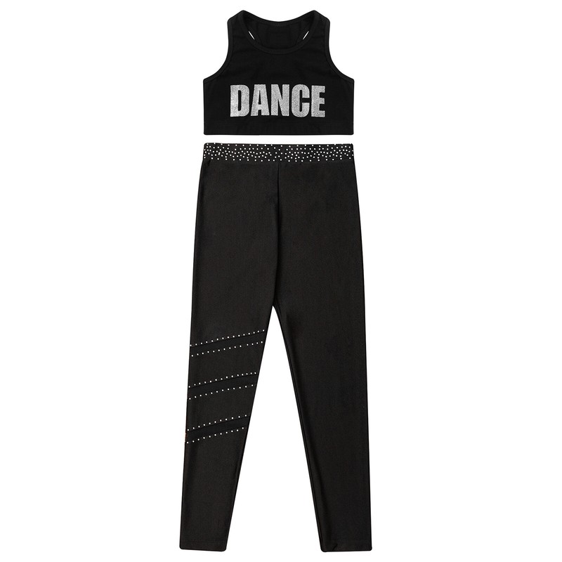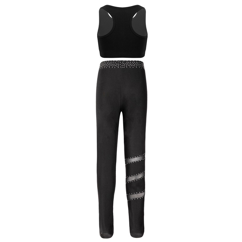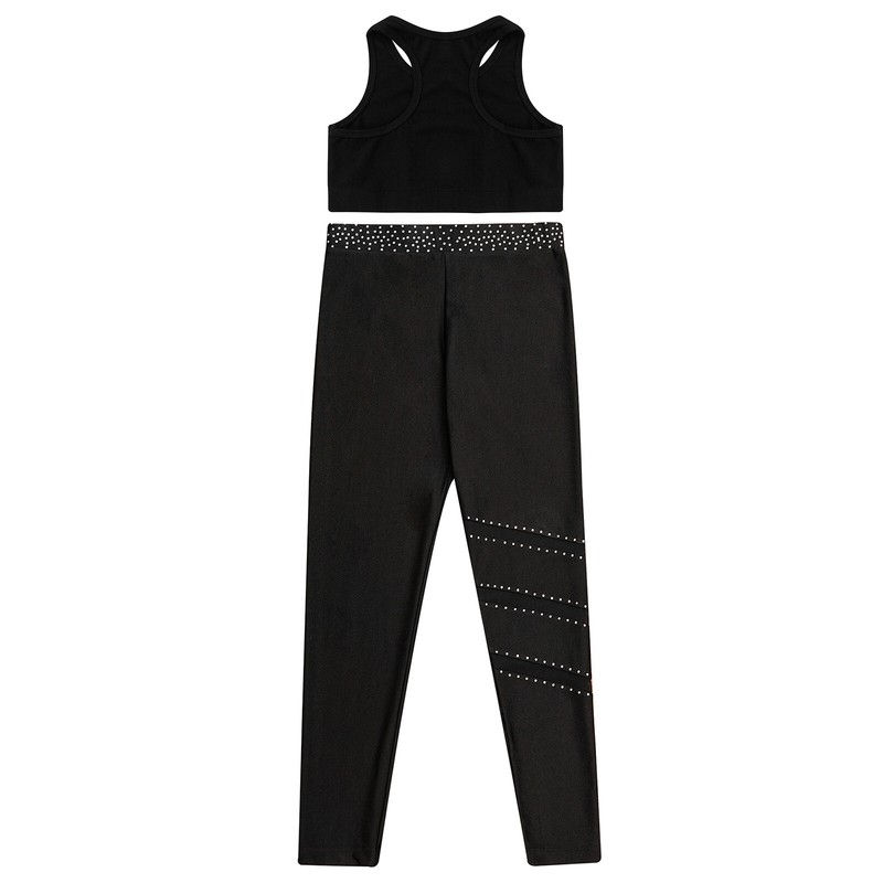 Matching elastic waistband leggings is adorned with sparkly rhinestones.