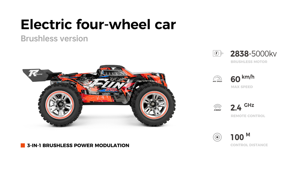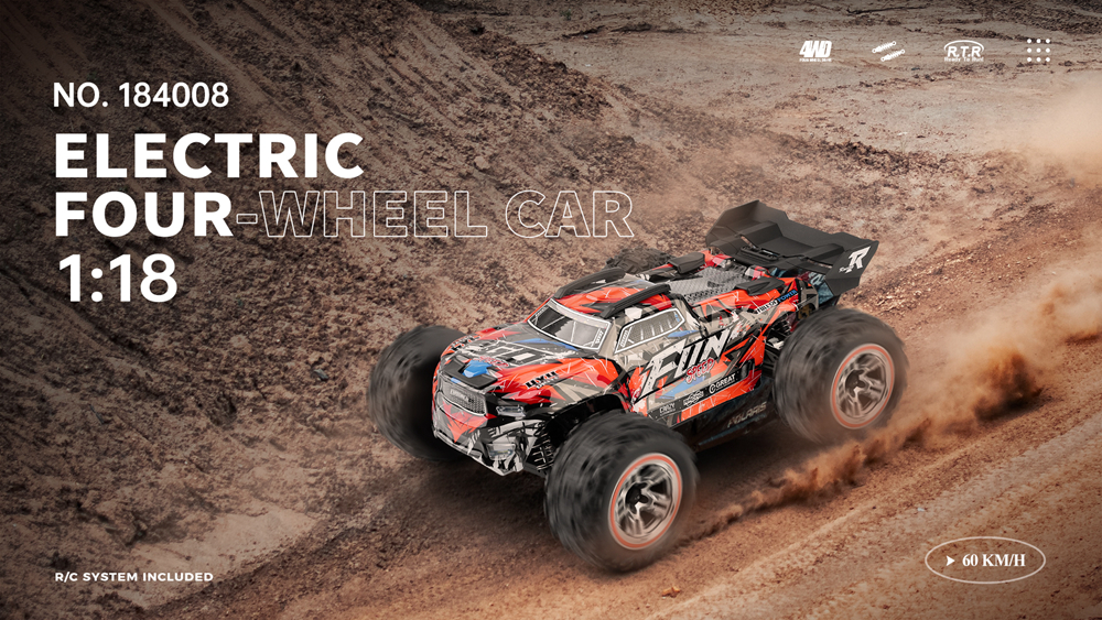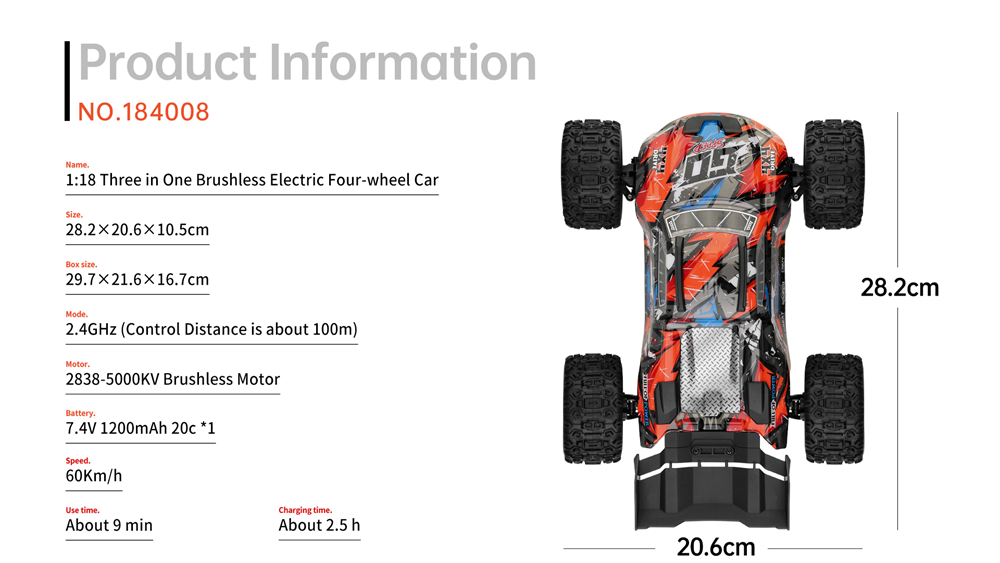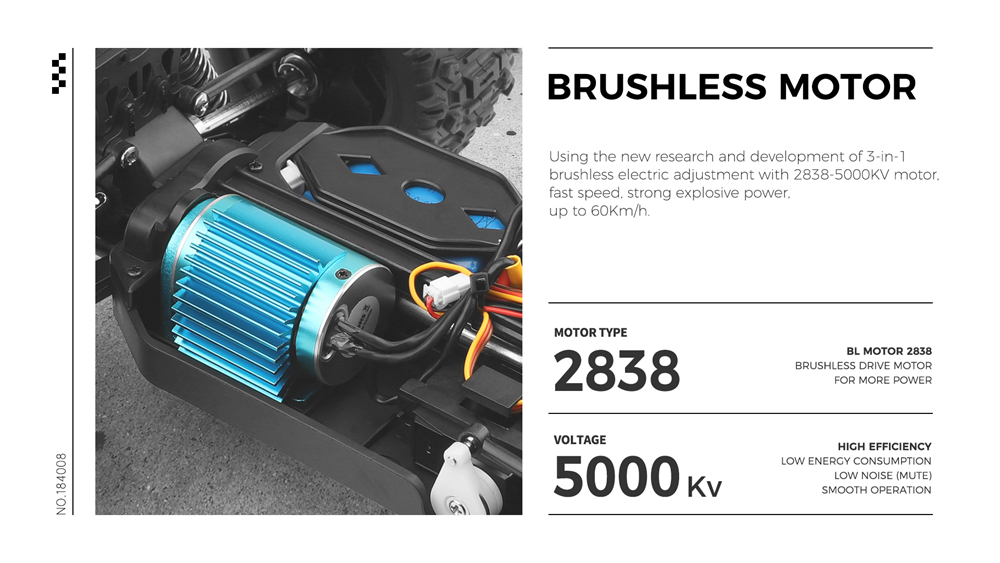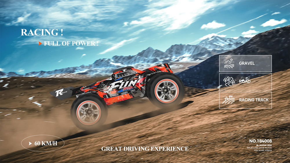 184008 RC car Using a newly developed 3 in 1 brushless ESC paired with 2838-5000KV motor, it has fast speed and strong explosive power. Using independent suspension hydraulic shock absorbers, the shock absorption performance can adapt to various terrains. Using zinc alloy gears, with strong wear resistance. The vehicle's colorful lighting system.