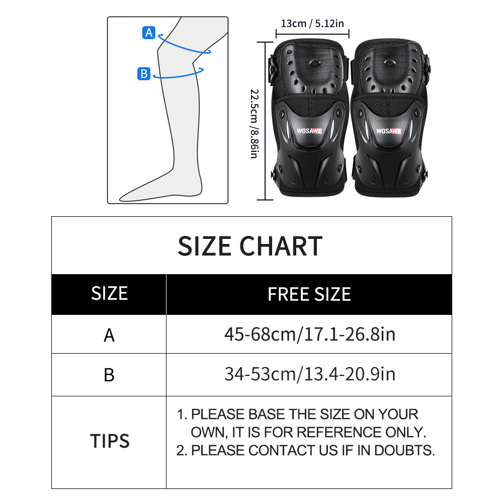 Knee Pads: Upper leg circumference 45-68cm, lower leg circumference 34-53cm