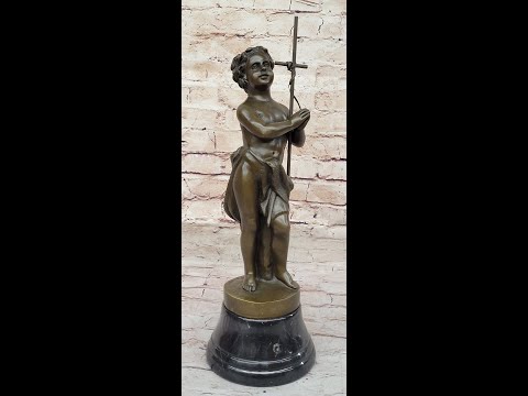 In this poignant bronze sculpture, a young boy stands with praying hands and peaceful eyes, serving as a messenger of God. The figure holds a tall cross in the crook of his arm, symbolizing his commitment to spreading the word of God. The brown patina of the sculpture, with subtle touches of gold in his curls and along the sash around his waist, adds warmth and depth to the portrayal.