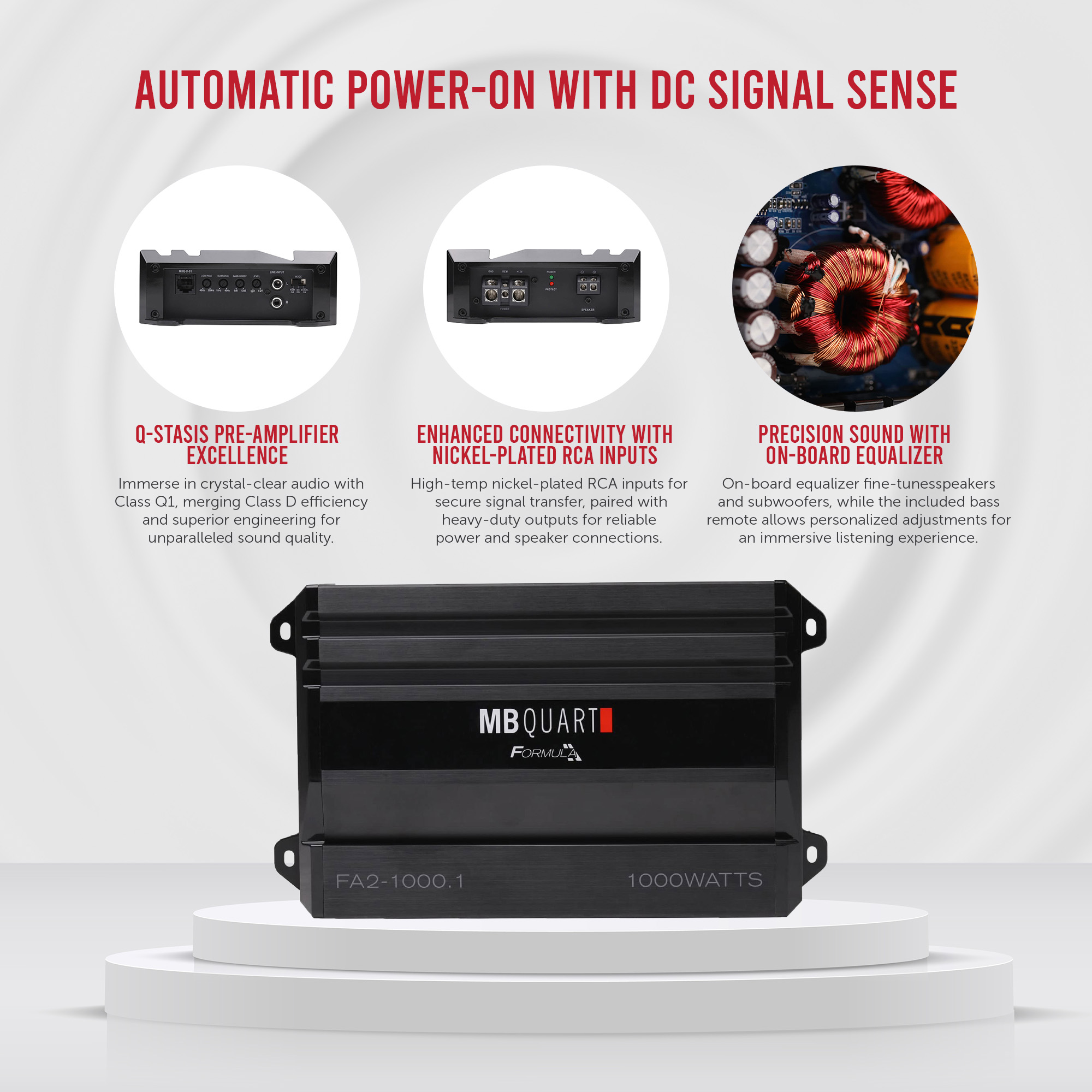 Immerse yourself in the ultimate sonic experience on the road with the MB Quart Formula 1,000-Watt 1-Ohm Stable Mono Car Audio Amplifier. This audio powerhouse delivers a staggering 1,000 watts of pure, dynamic power, transforming your vehicle into a mobile concert hall.