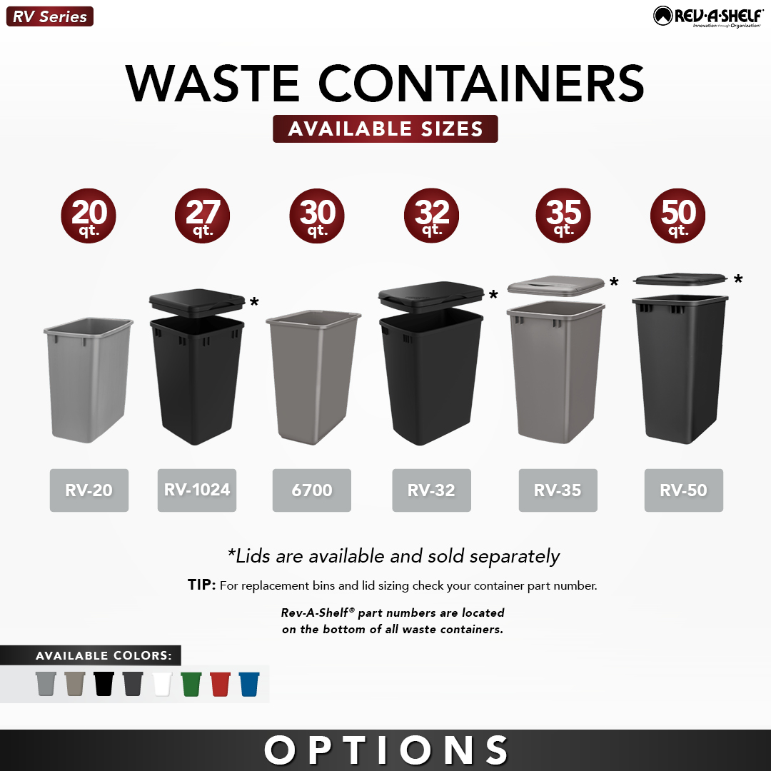 Please note, the Rev-A-Shelf waste container frames are sold separately. So, keep your home looking neat and smelling even better while also conserving space with the set of 2 Rev-A-Shelf 35 qt. Waste Containers.
