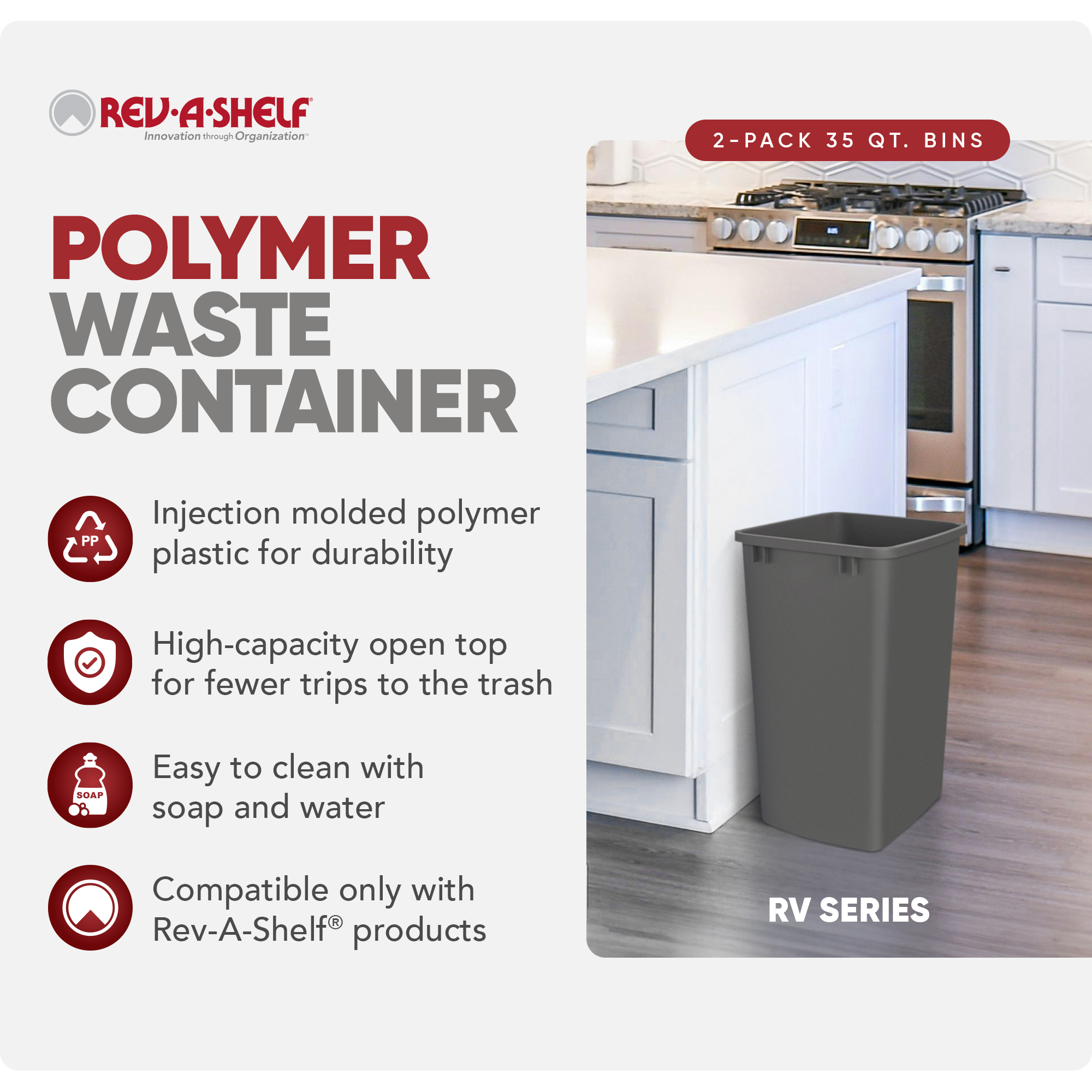 The 35 qt. Polymer Replaceable Trash Bins from Rev-A-Shelf are the perfect solution for your kitchen waste needs while being compatible with Rev-A-Shelf Pullouts. Conveniently store your trash bins tucked away in your drawers or cupboards so you can maintain your kitchen's lovely appearance, or keep the waste bins in other various locations around your apartment, home, or office to minimize waste being left out.