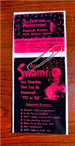 This is a two piece set of replacement signs for the Ask Swami Fortune coin op machine. They are not originals but I had some nice original ones that I used to photo copy onto quality photo paper.